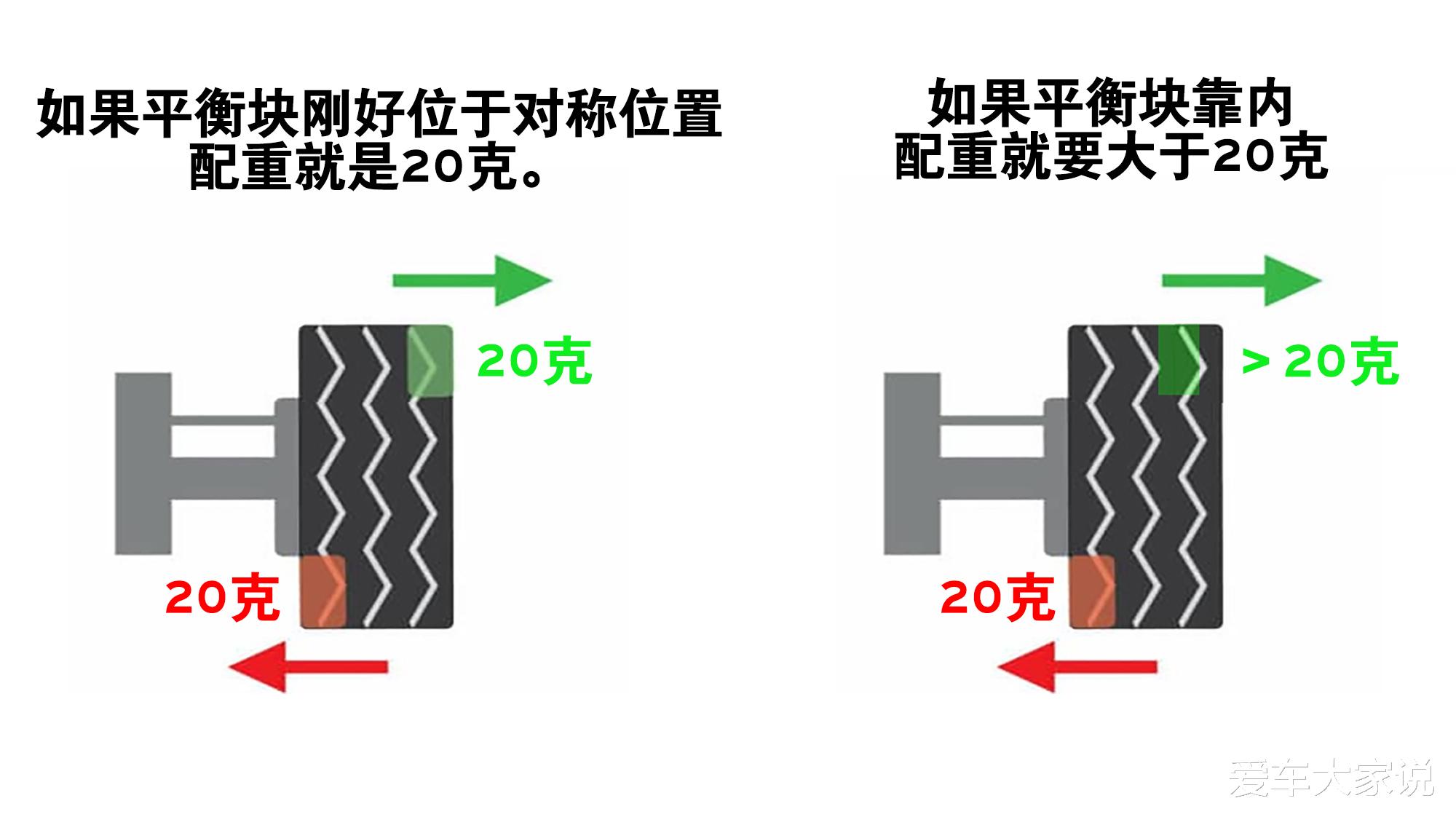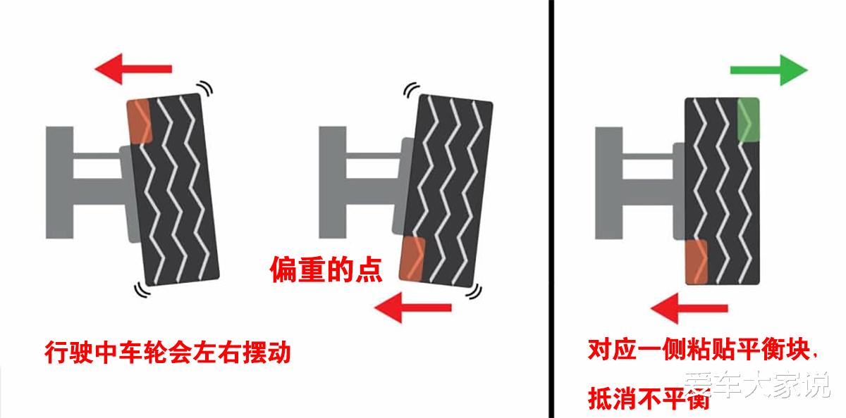 平衡块就是配重的,就像下图那样,如果轮胎某个位置偏重,那么行驶中偏重的地方会导致轮子左右摇摆。这时候就要在轮圈相对应的另一侧相同位置贴一个同等质量的平衡块,跟挑扁担一样,这样就整体配平了,跑再快都不会抖了。
