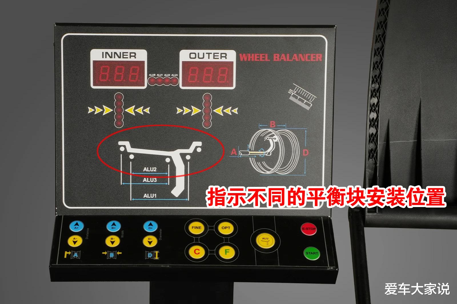 但仪器检测出来偏重的位置都在边缘,很明显咱不能把平衡块装在轮胎边角上,所以仪器就要根据距离换算一下重量,把平衡块贴在合适的地方。平衡块越靠近车轮外边,需要的配重量越小。越靠近里面,需要的配重量越大。