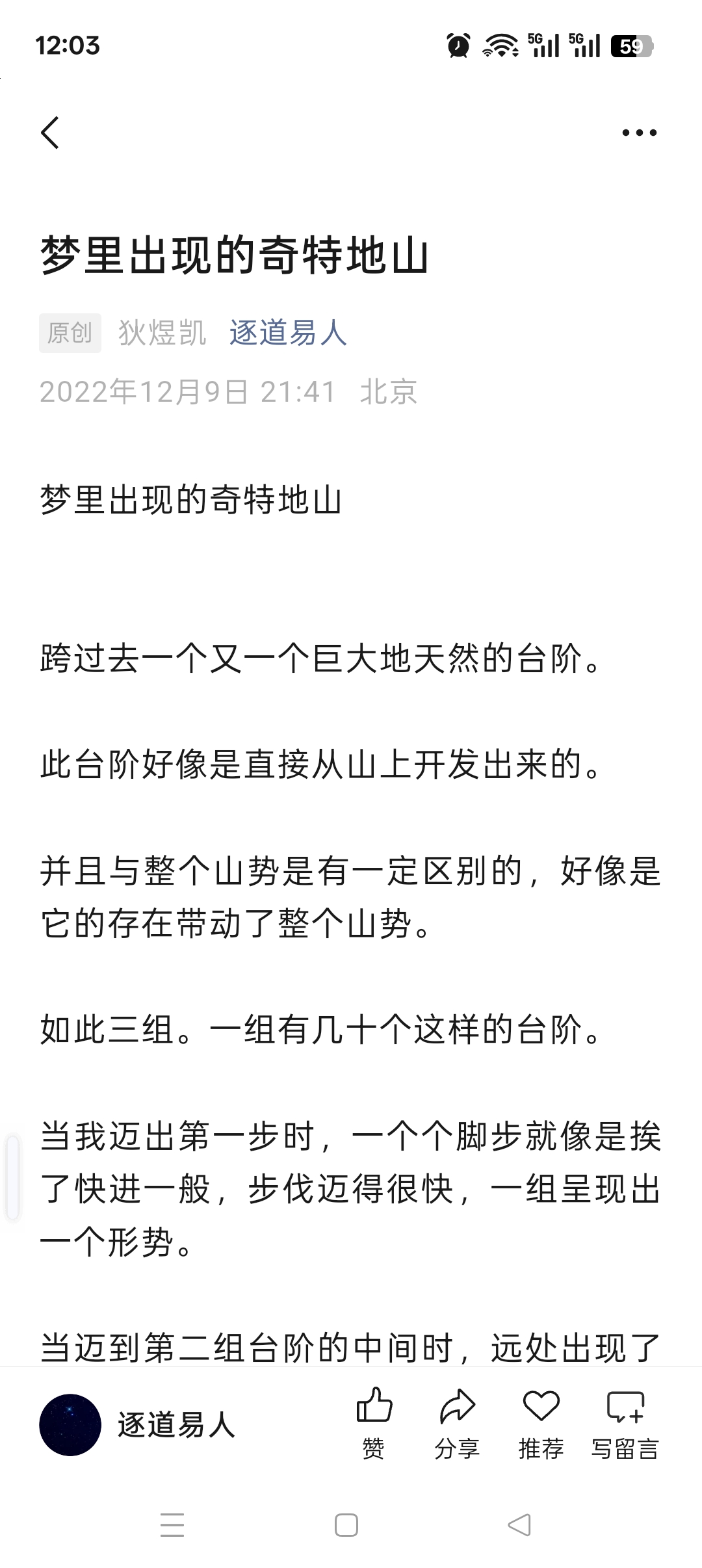 《梦里出现的奇特地山》一文中是这样描述的:一天的凌晨,初醒未醒时,耳边响起了一句:世无常性可多雨,gqzbgqz,后来我便写下了《实在不行就“立庙”》。其中有一句是这样的:
