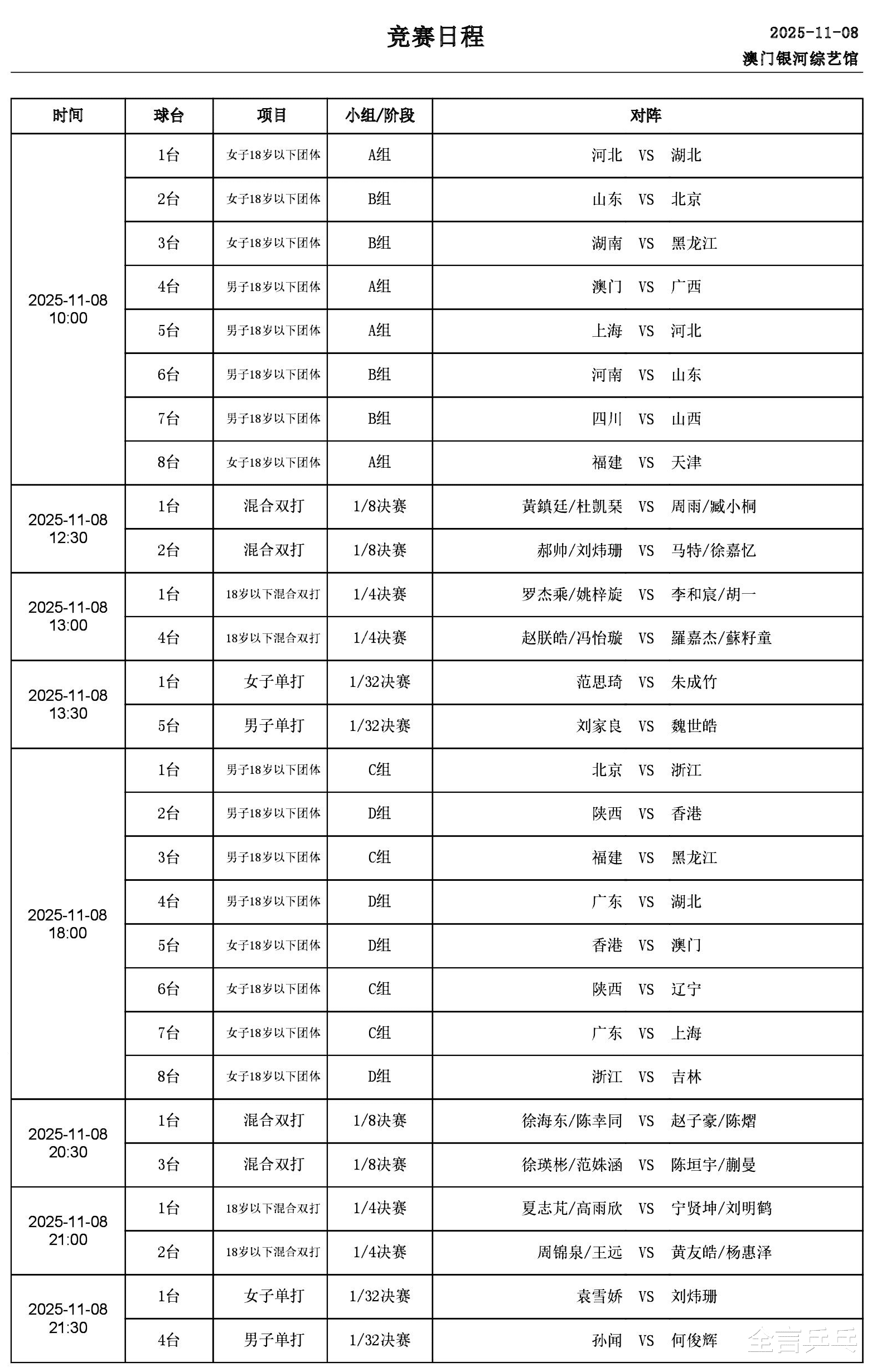 20:30,徐海东/陈幸同VS赵子豪/陈熠、陈垣宇/蒯曼VS徐瑛彬/范姝涵。