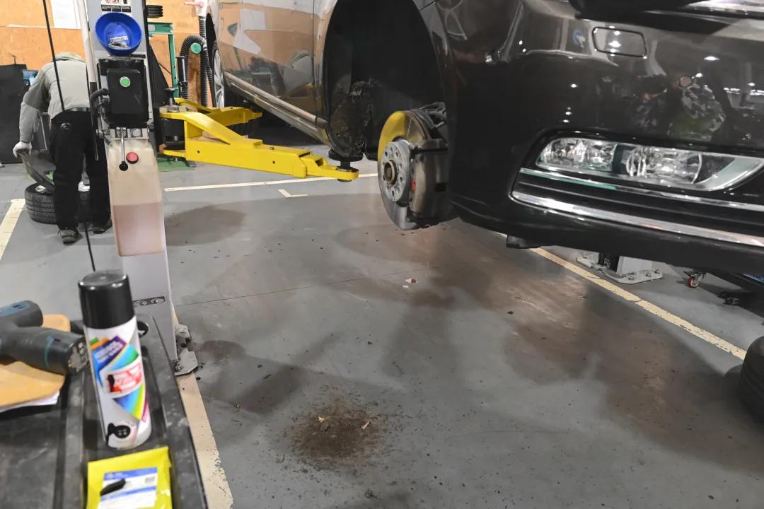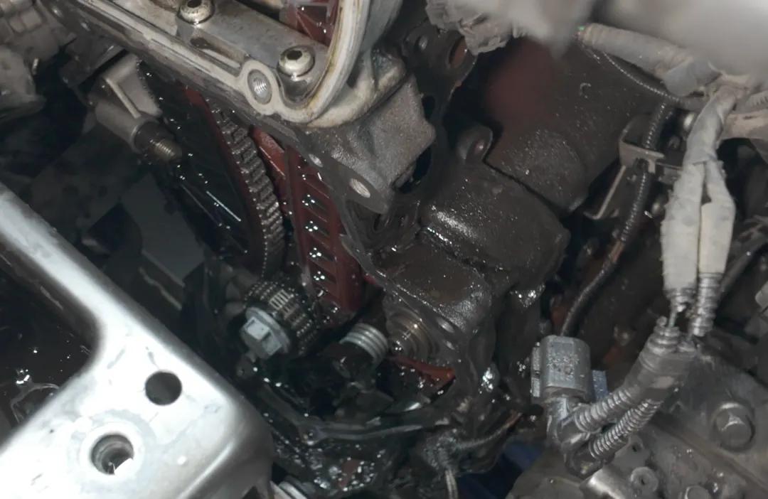 把车举起来,能看见漏出的机油随风飘洒,让底盘变得油糊糊,有时甚至还会漏到排气歧管上烧出糊味。
