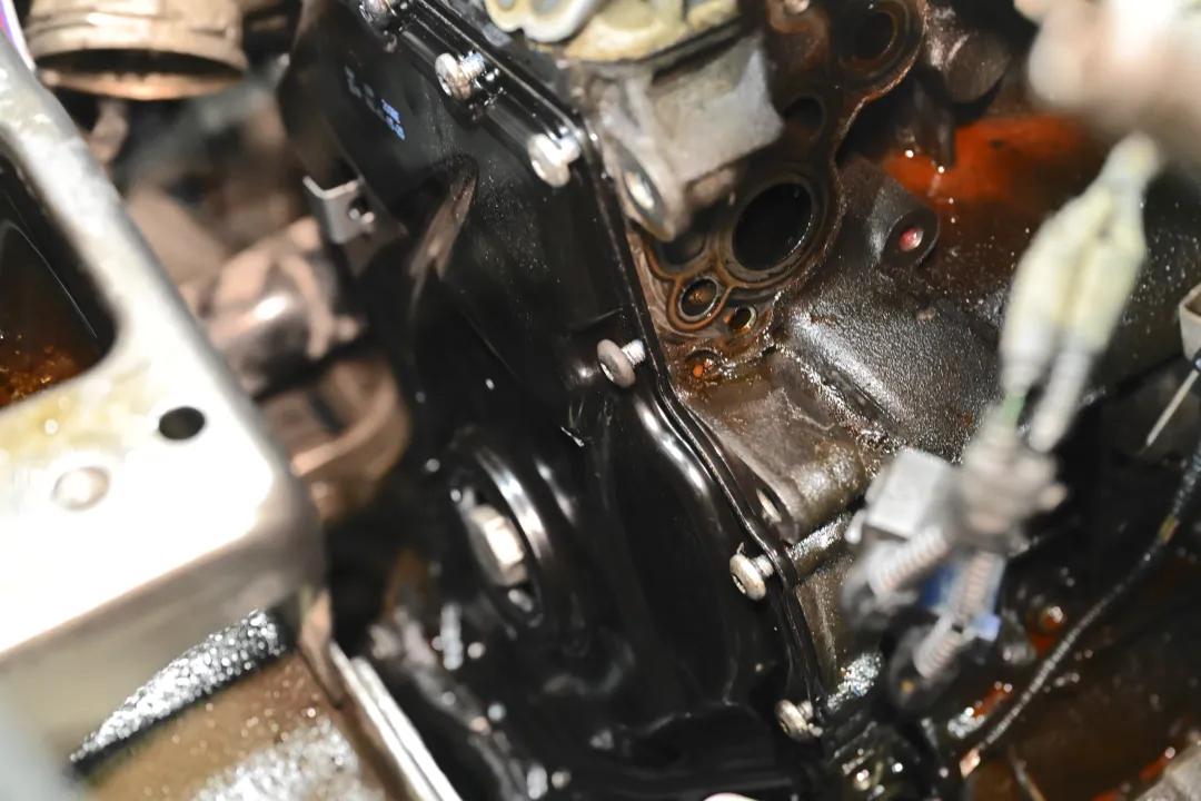 技师发现,它不仅凸轮轴密封圈、高压油泵、废气阀都已经开始漏油,老生常谈的气门室盖也因为密封件老化渗出油渍,就连机油盖密封圈也失效了。而机油散热器,也是最严重的漏油点,就能看见机油滴挂往下流。