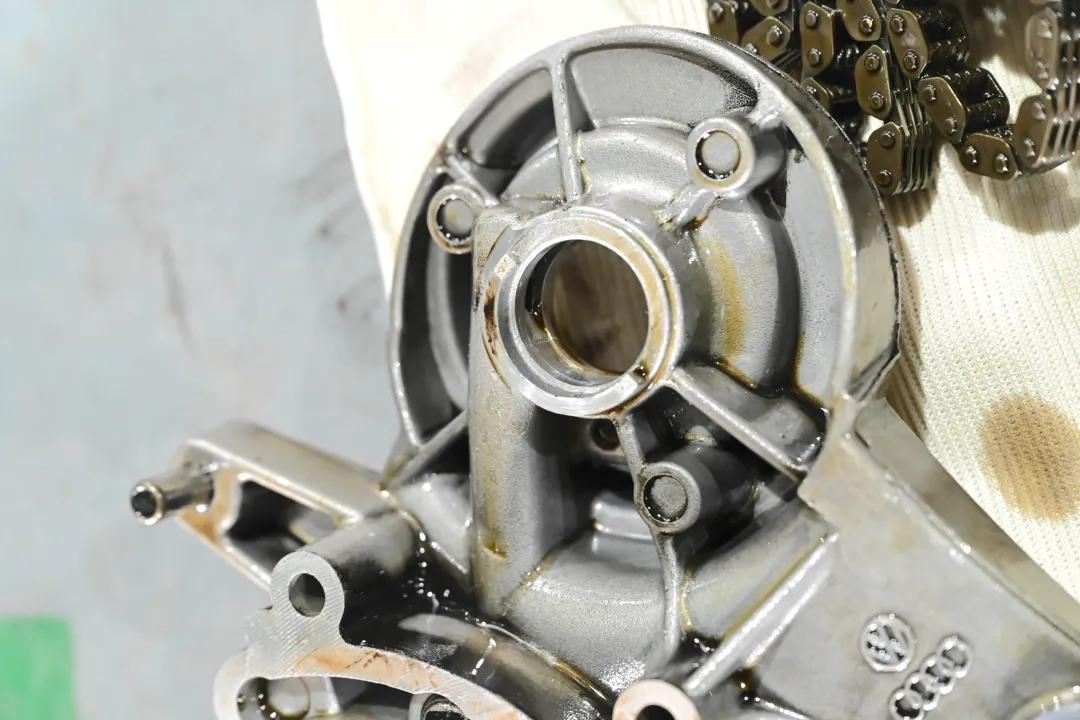 它的正时上盖因为渗油这次需要更换,而下盖板却一般不会漏油,毕竟,它是需要打胶后再安装的。而拆它的原因,自然是要更换正时链条和内部的链条导轨、链板。