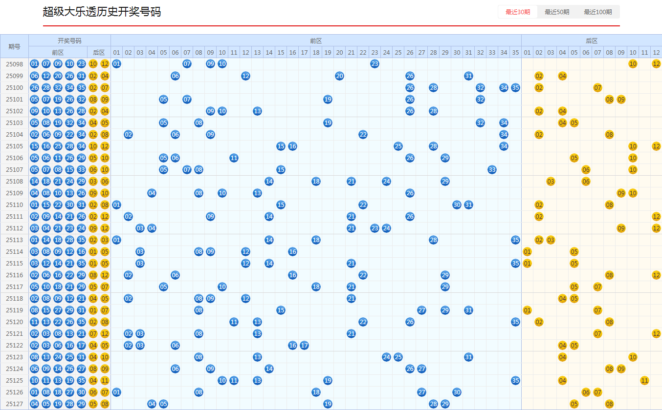 前区冷号(低频):12、14、30、31、33(近100期出现≤12次)