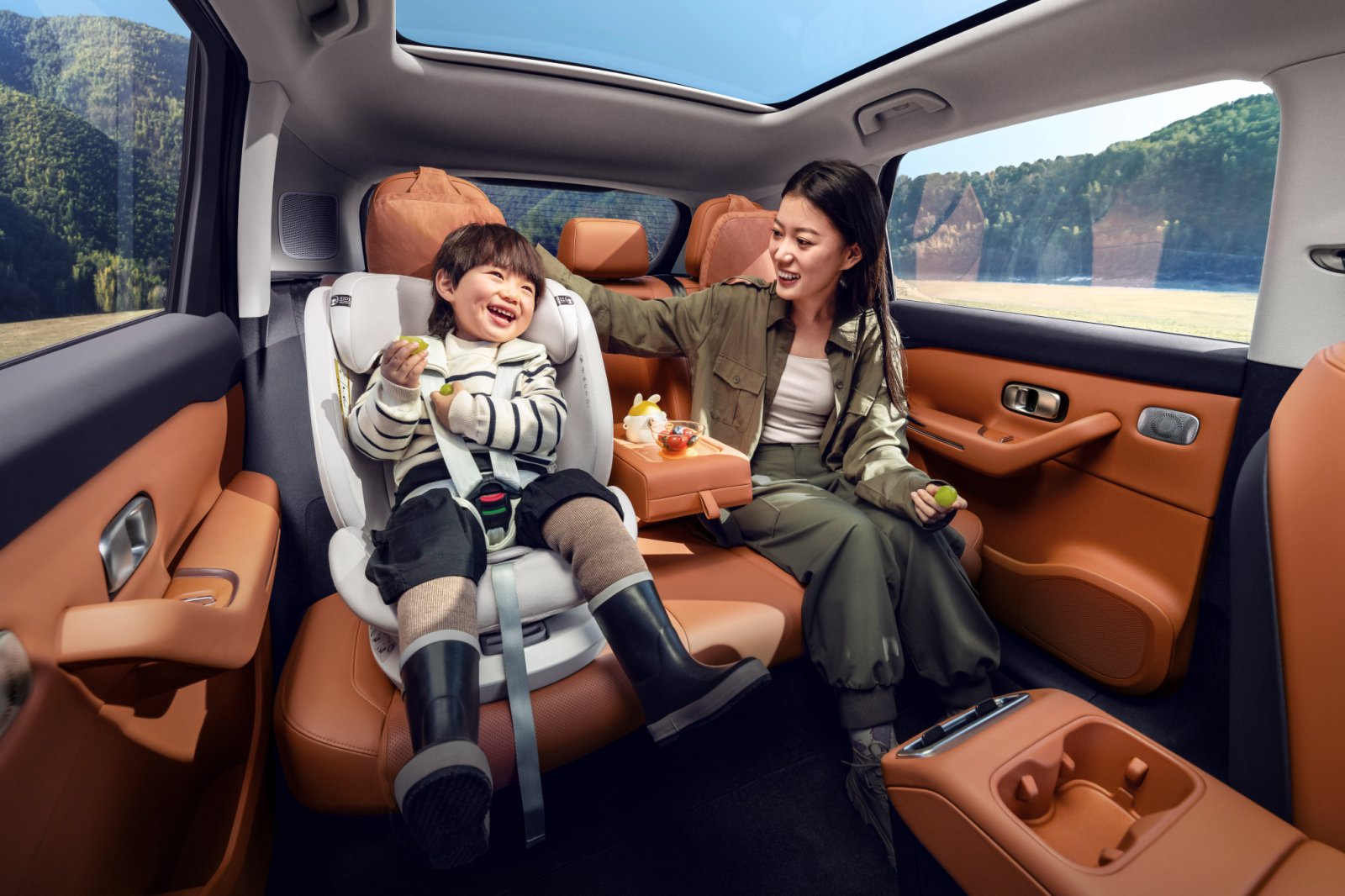 储物空间更是丰富到超出预期,全车大大小小有26处储物格,光杯托就有5个,就算后排坐三个人,每个人都能分到杯托。前排扶手箱下面是掏空设计的,能放下纸巾盒、我的斜挎包,甚至孩子的小书包,利用率特别高。贴心的是后排中央扶手的亲子置物平台,带娃出门时,孩子的保温杯、辅食吸盘碗都能放在上面,不用再手忙脚乱地递来递去,喂孩子吃饭也方便多了。