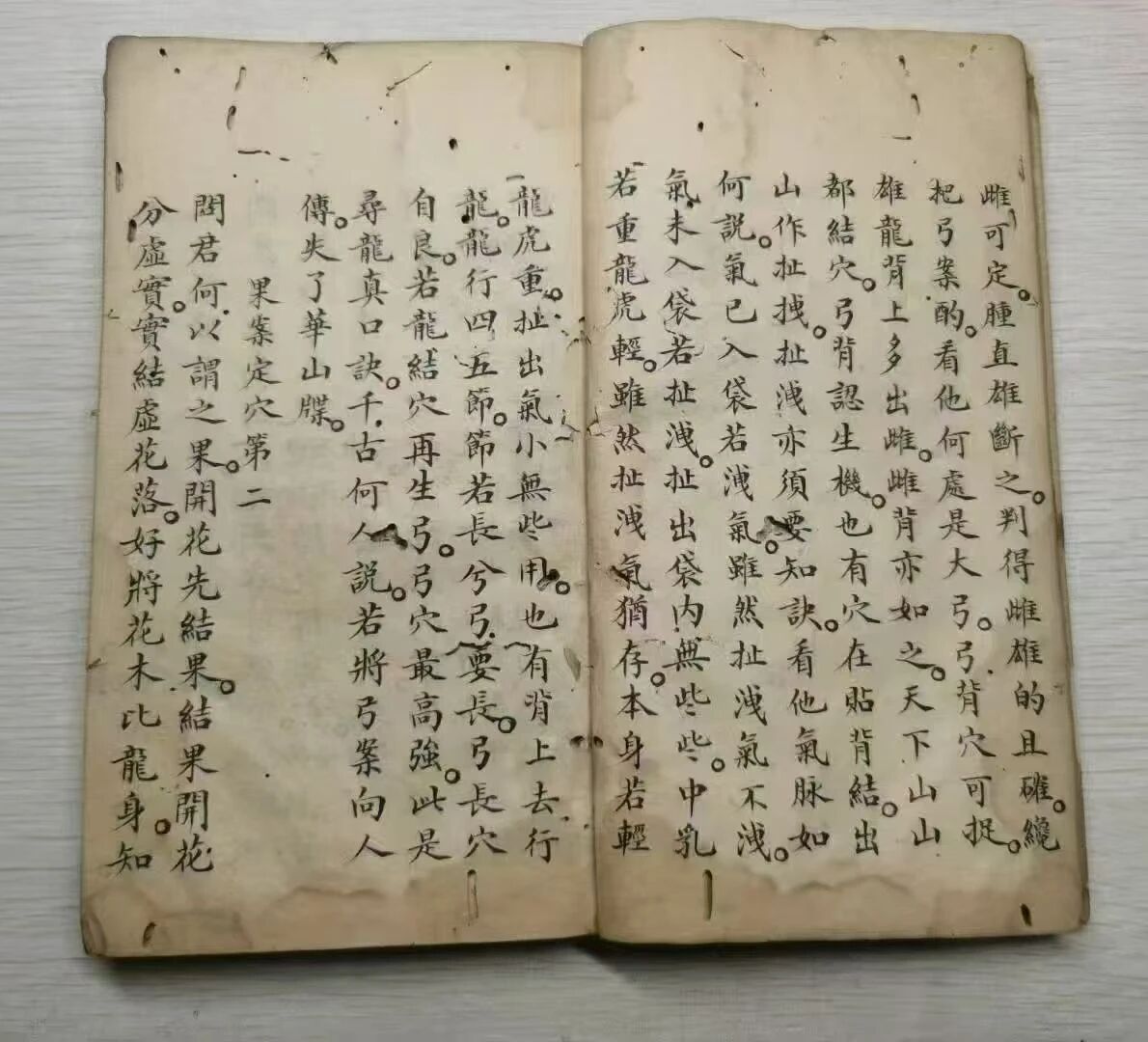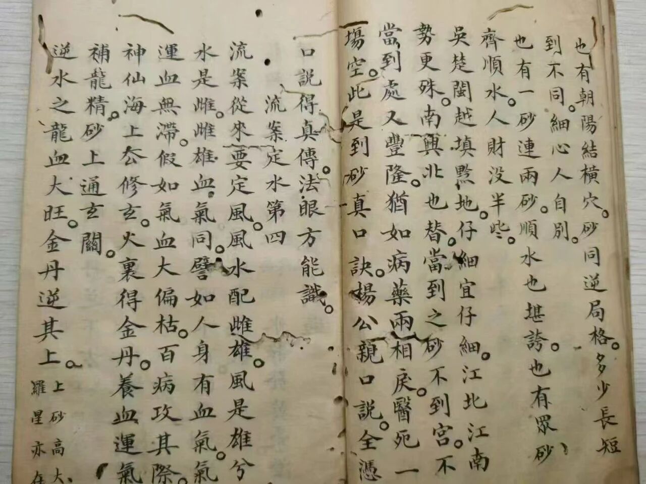 版本价值堪称顶级:清早期手抄本原貌保留,87筒子页175面写满无缺,46面精美山水图共一百多幅,书法绘图双优,兼具文献价值与艺术价值。作为金陵禅林二十八代孙泐长老口授秘本,传承脉络清晰,更承载风水大师曾落成真传秘诀,相较于普通风水典籍更具正统性与稀缺性。虽有虫蛀但内容可辨,后十页修复不影响核心秘术传承,两册成套流传,是研究清代禅林风水传承、地理心诀秘术的稀缺文献,同时具备极高的收藏增值潜力,在同类风水手抄本中堪称可遇不可求。