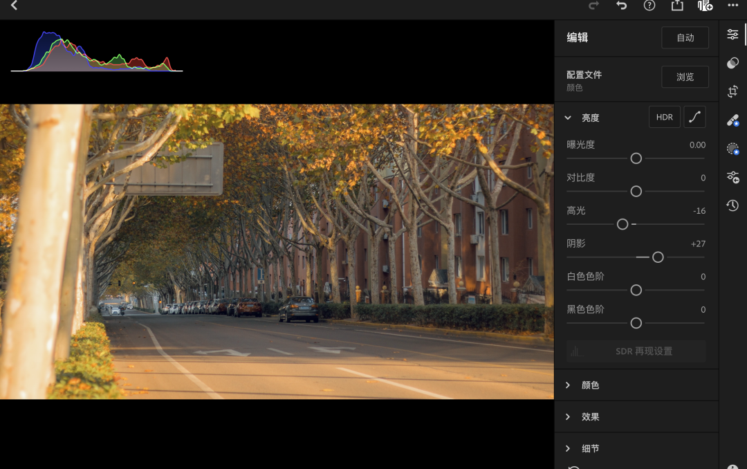 高光/阴影工具:降低高光,找回天空、云彩的细节;提升阴影,让暗部(如树林、建筑背光面)显现细节。这是最常用的一招。