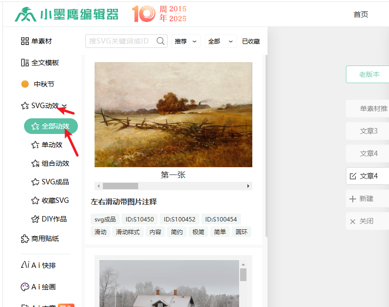 1、先打开小墨鹰编辑器,找到左侧功能栏中的「SVG 动效」,点击展开后选择「全部动效」,就能进入动效素材库,里面有各种实用 SVG 动效,涵盖弹幕、悬浮、切换等多种类型。