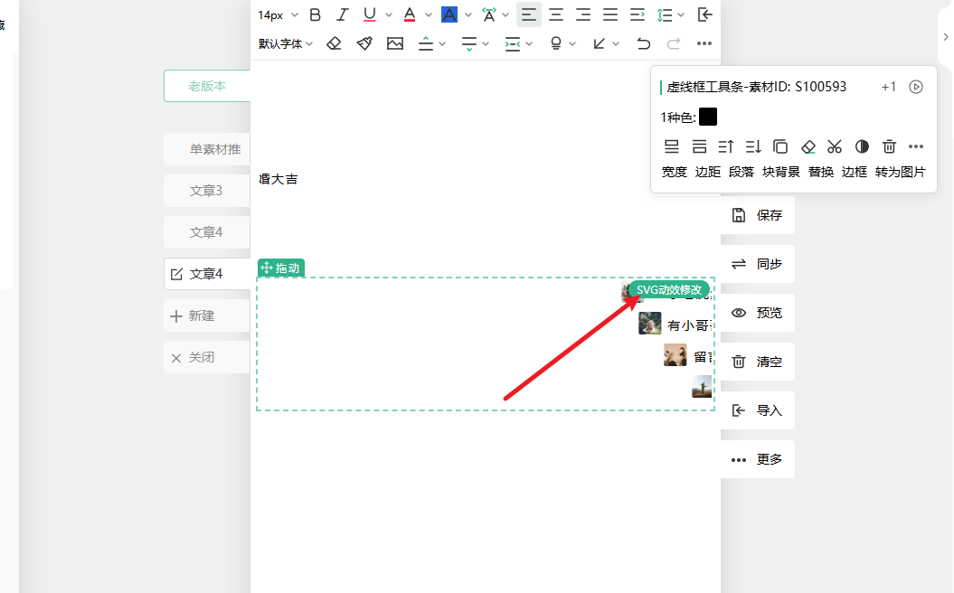 3、单击选中编辑区里的弹幕素材,此时素材右上角会自动弹出「SVG 动效修改」的按钮,点击这个按钮,就能自由修改弹幕中的文字内容、调整文字颜色和大小,还能替换弹幕中的图片,适配自己的推文风格。