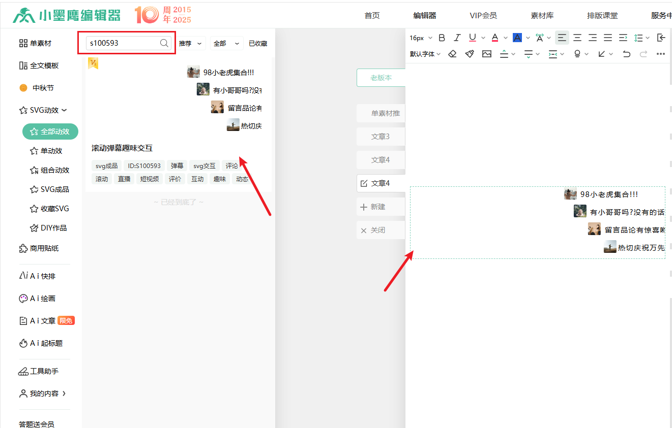 2、不用慢慢筛选,省时技巧安排上:在素材库顶部的搜索框里,直接输入专属编号「s100593」,一键定位滚动弹幕素材,找到对应素材后,点击「写入编辑区」,素材就会自动同步到中间的编辑界面。