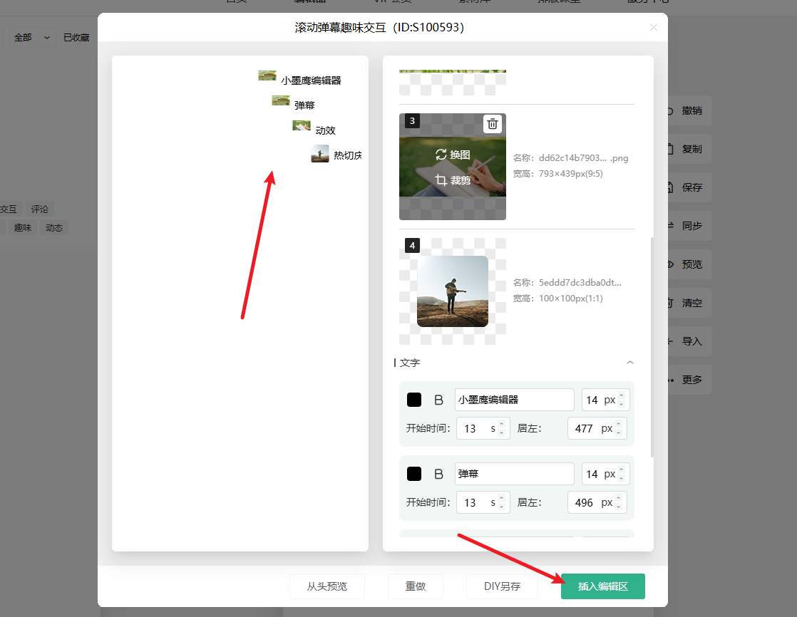 4、所有修改完成后,左侧会实时显示弹幕的最终滚动效果,可反复调整直到满意,确认无误后,再次点击「插入编辑区」,滚动弹幕就彻底添加完成啦。