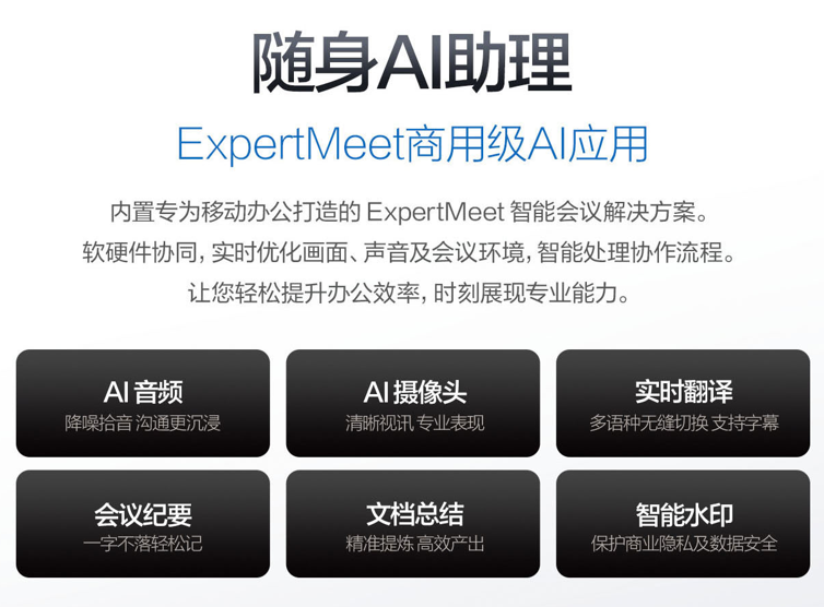华硕破晓Ultra深度整合AI能力于商务场景,内置ExpertMeet AI会议助手,提供AI降噪拾音、清晰视讯、实时字幕翻译、会议纪要自动生成及智能文档摘要等强大功能。