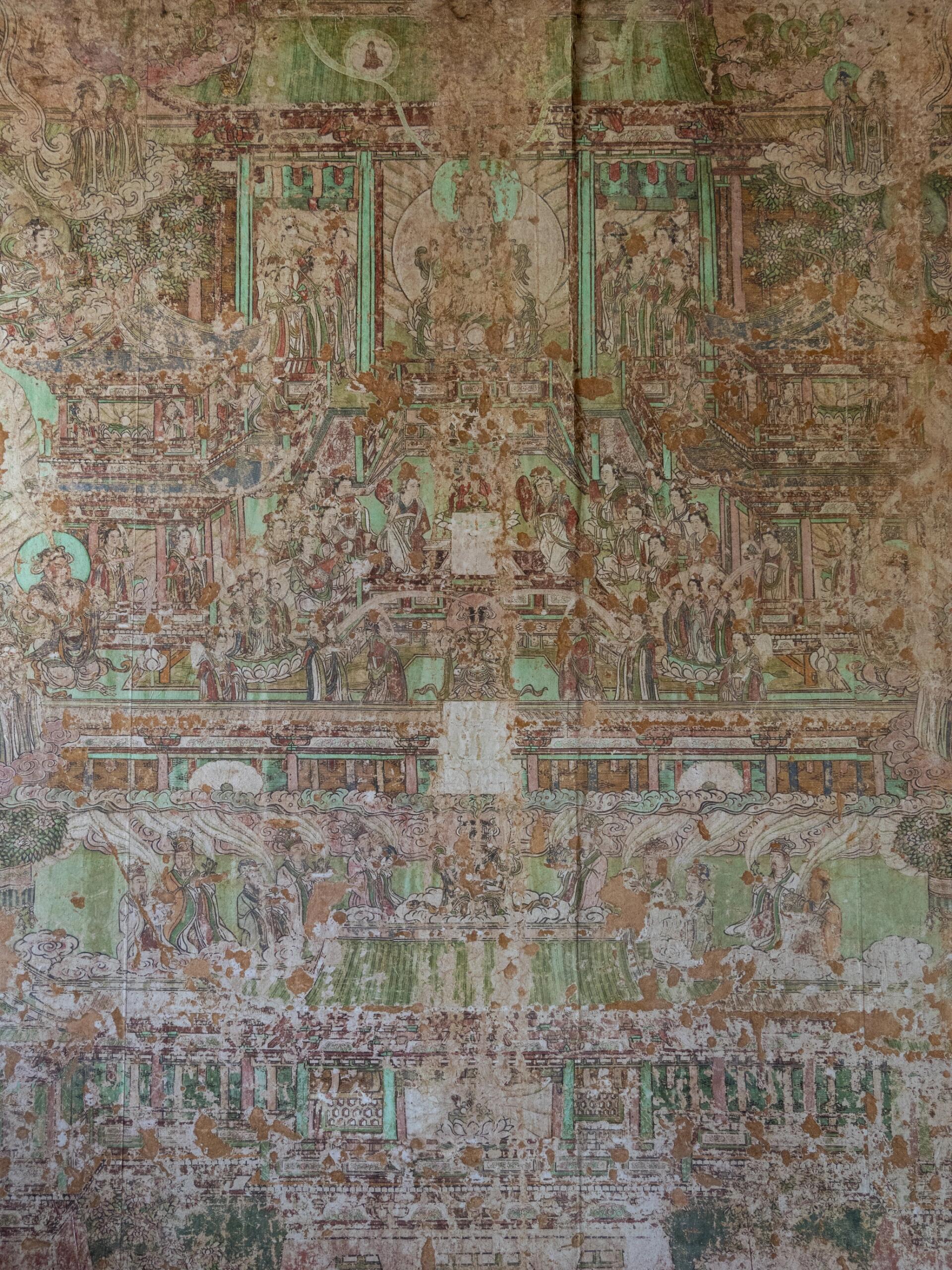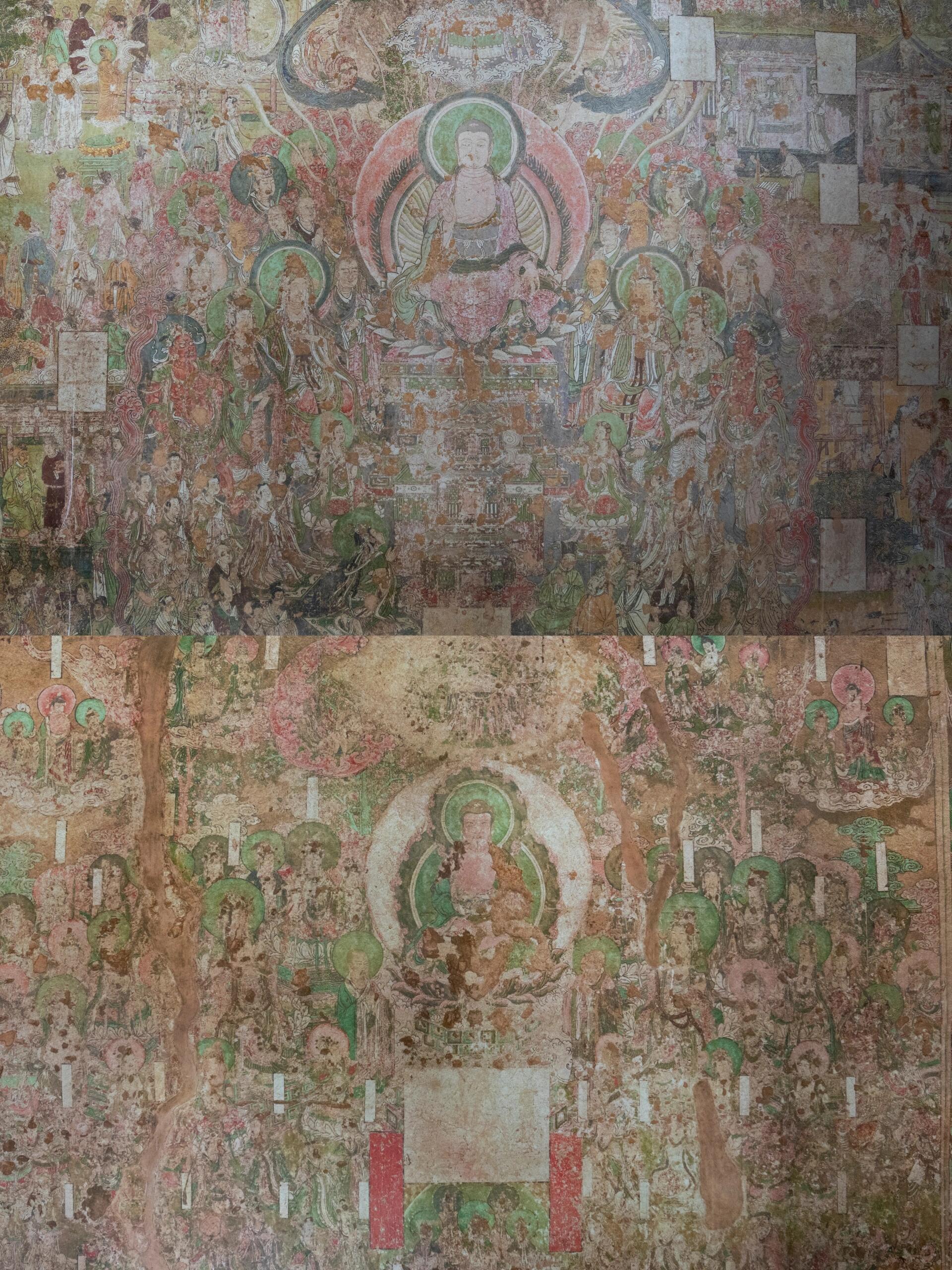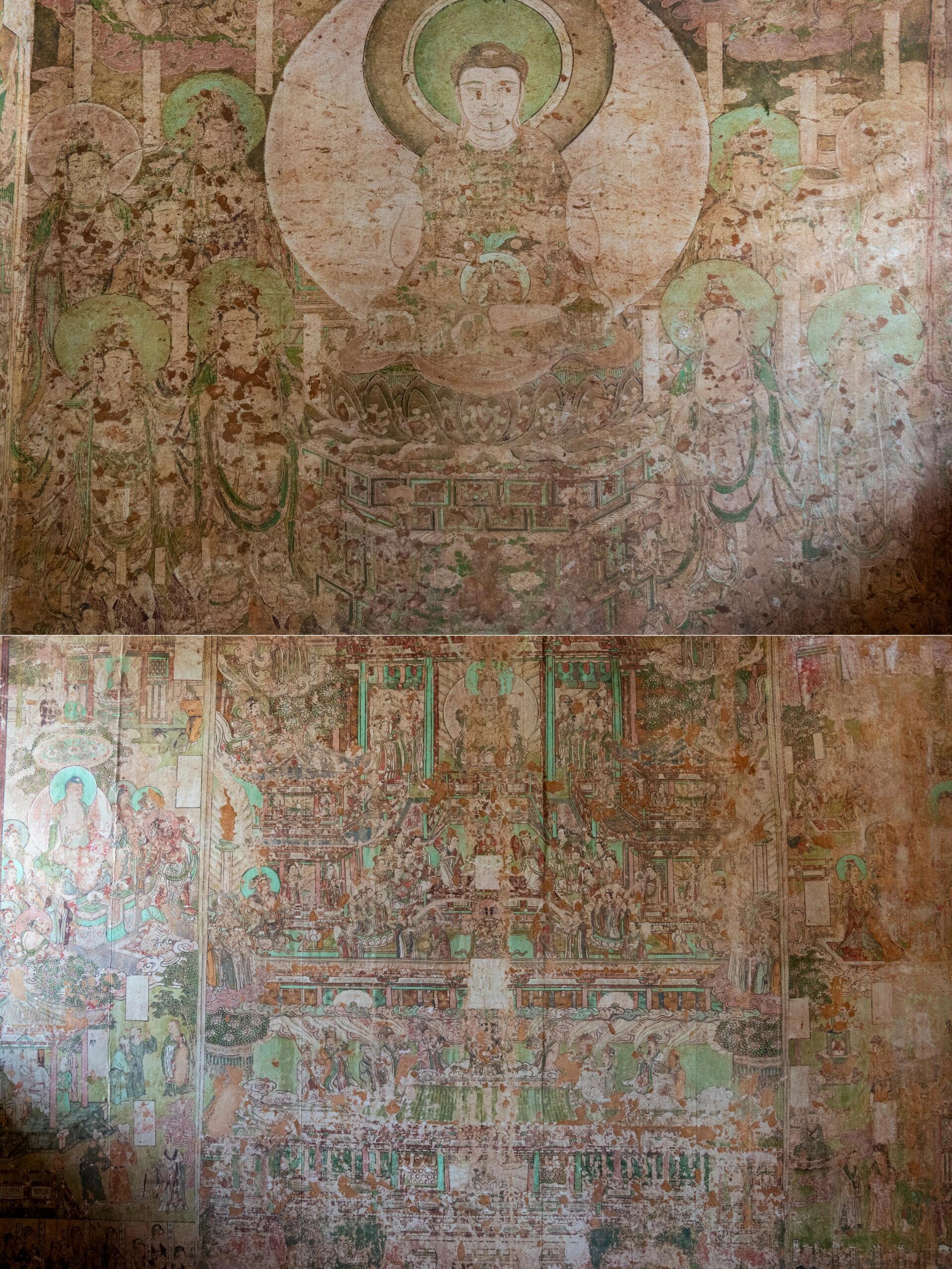 而三面墙壁上的壁画,更是堪称国宝级文物。这些绘制于北宋元祐七年至绍圣三年的《清凉图》,总面积达88.7㎡。走近细看,壁画上的天宫楼阁结构严谨,飞檐斗拱刻画入微,仿佛能让人走进画中的世界;众多仙人神态各异,有的手持法器,神情庄严;有的衣带飘飘,姿态优雅。最令人称奇的是,壁画中使用的绿松石颜料,历经九百多年依然清晰可见,那一抹抹深邃的蓝色,为整个画面增添了神秘而高贵的气质。画工们用细腻的笔触,将经变故事中的每一个细节都描绘得栩栩如生,人物的表情、衣褶的走向、场景的布置,无一不展现出高超的绘画技艺。