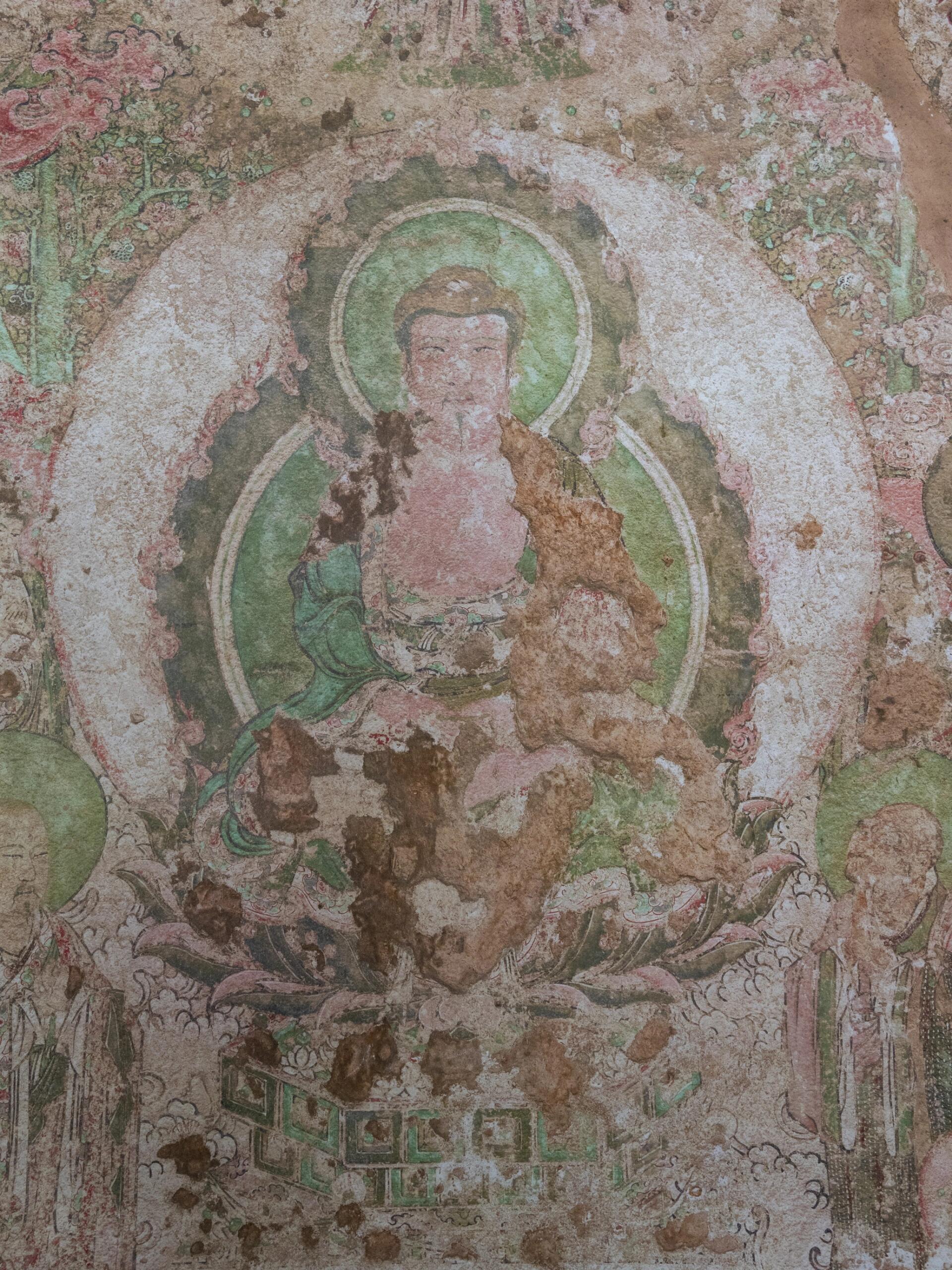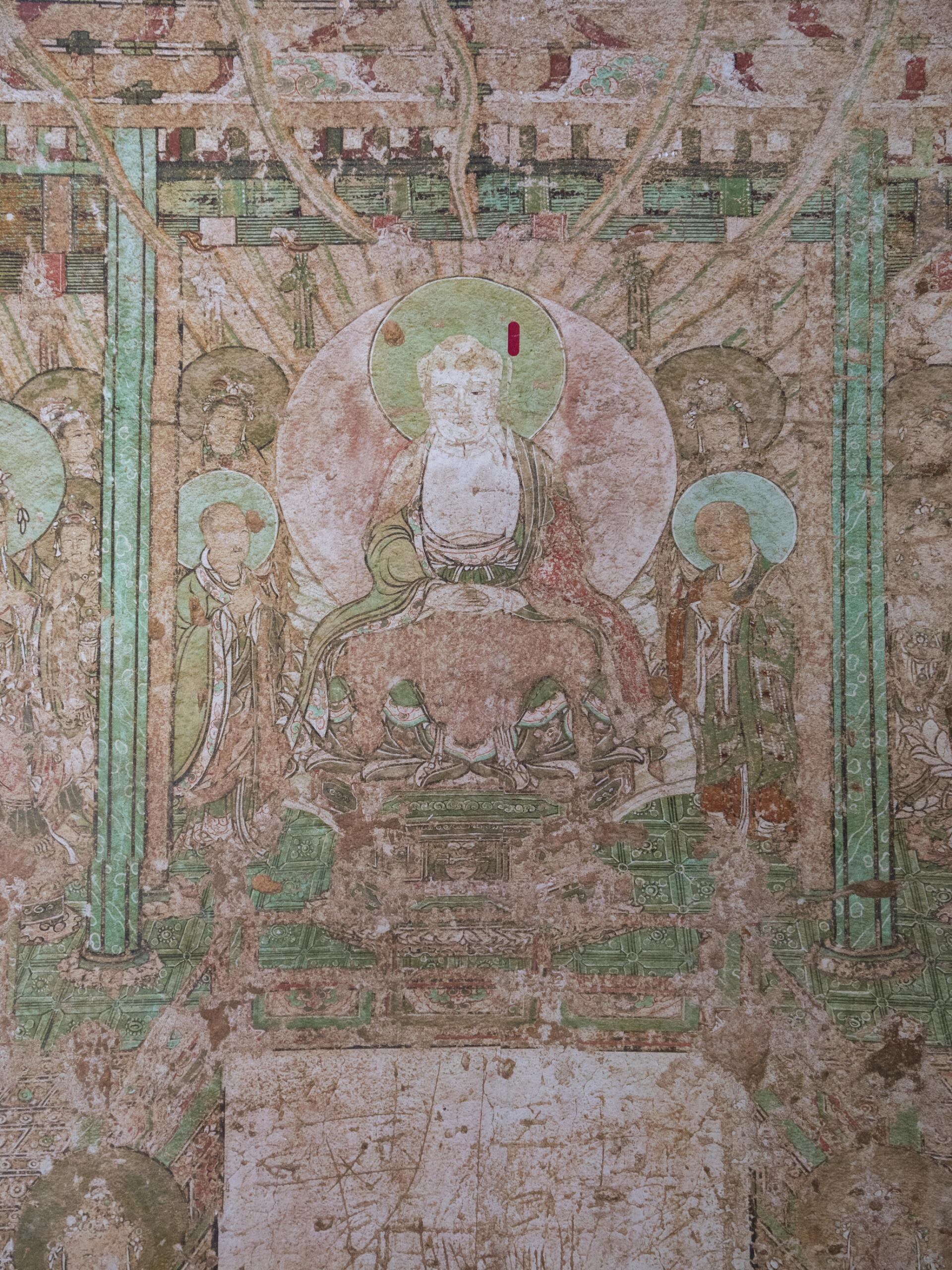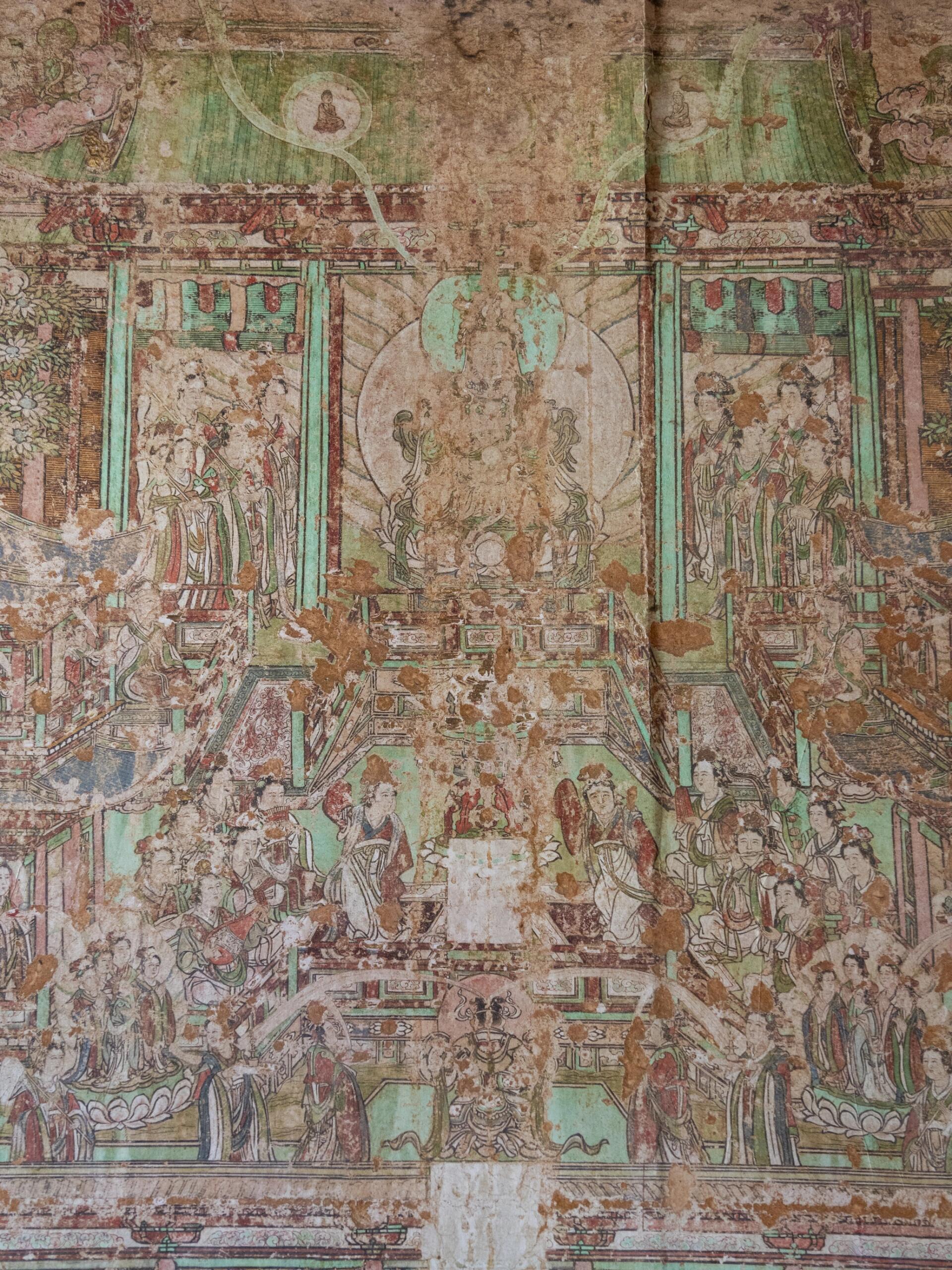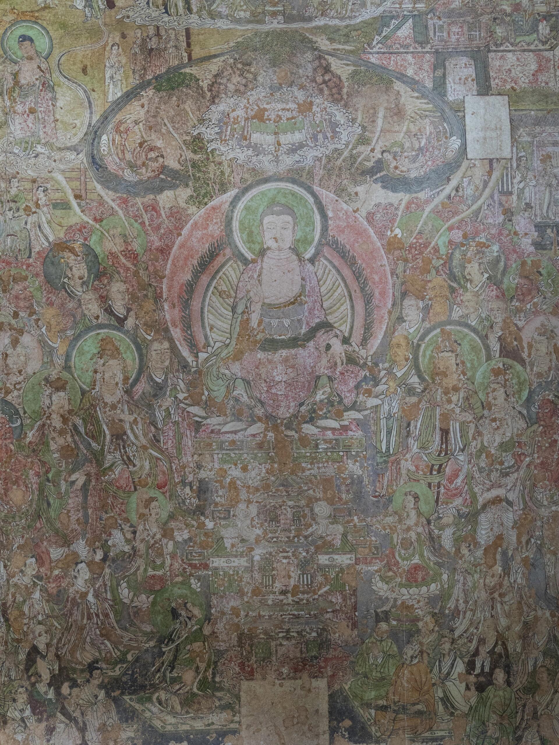 而三面墙壁上的壁画,更是堪称国宝级文物。这些绘制于北宋元祐七年至绍圣三年的《清凉图》,总面积达88.7㎡。走近细看,壁画上的天宫楼阁结构严谨,飞檐斗拱刻画入微,仿佛能让人走进画中的世界;众多仙人神态各异,有的手持法器,神情庄严;有的衣带飘飘,姿态优雅。最令人称奇的是,壁画中使用的绿松石颜料,历经九百多年依然清晰可见,那一抹抹深邃的蓝色,为整个画面增添了神秘而高贵的气质。画工们用细腻的笔触,将经变故事中的每一个细节都描绘得栩栩如生,人物的表情、衣褶的走向、场景的布置,无一不展现出高超的绘画技艺。