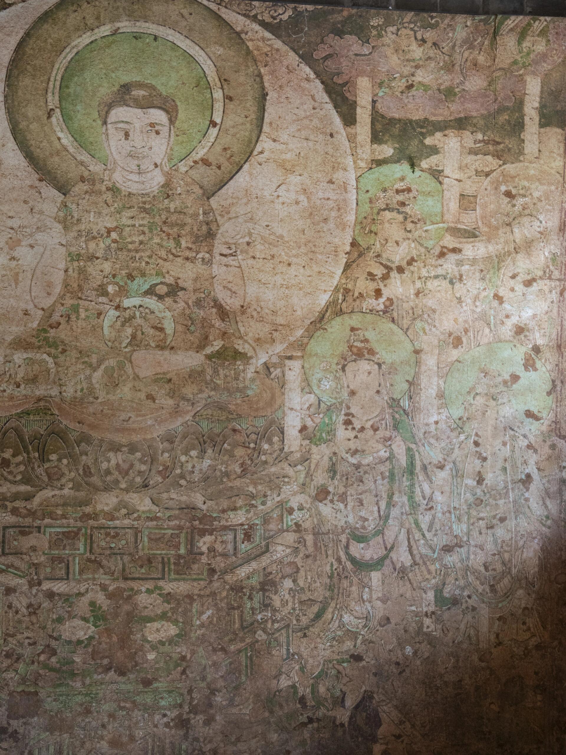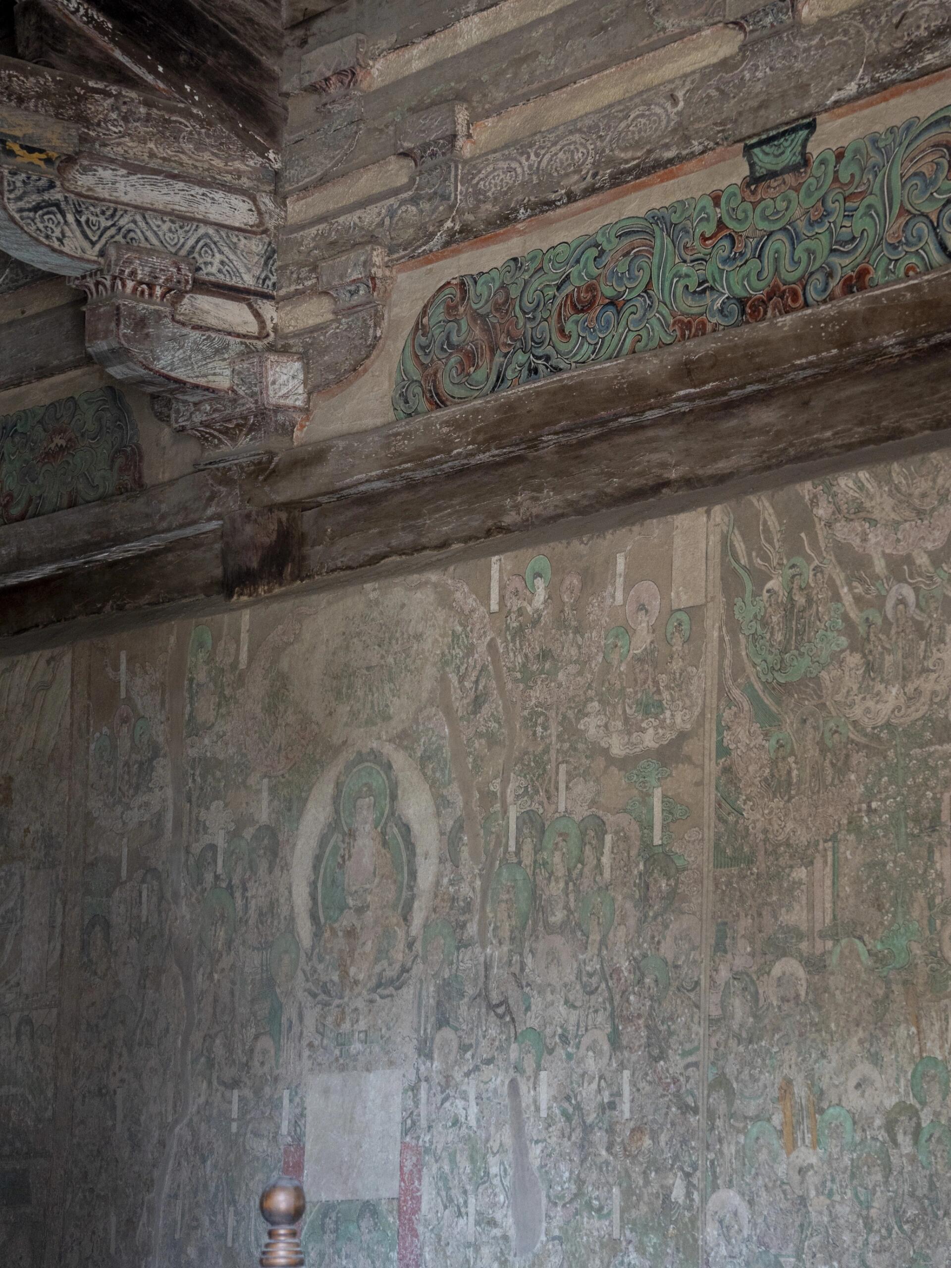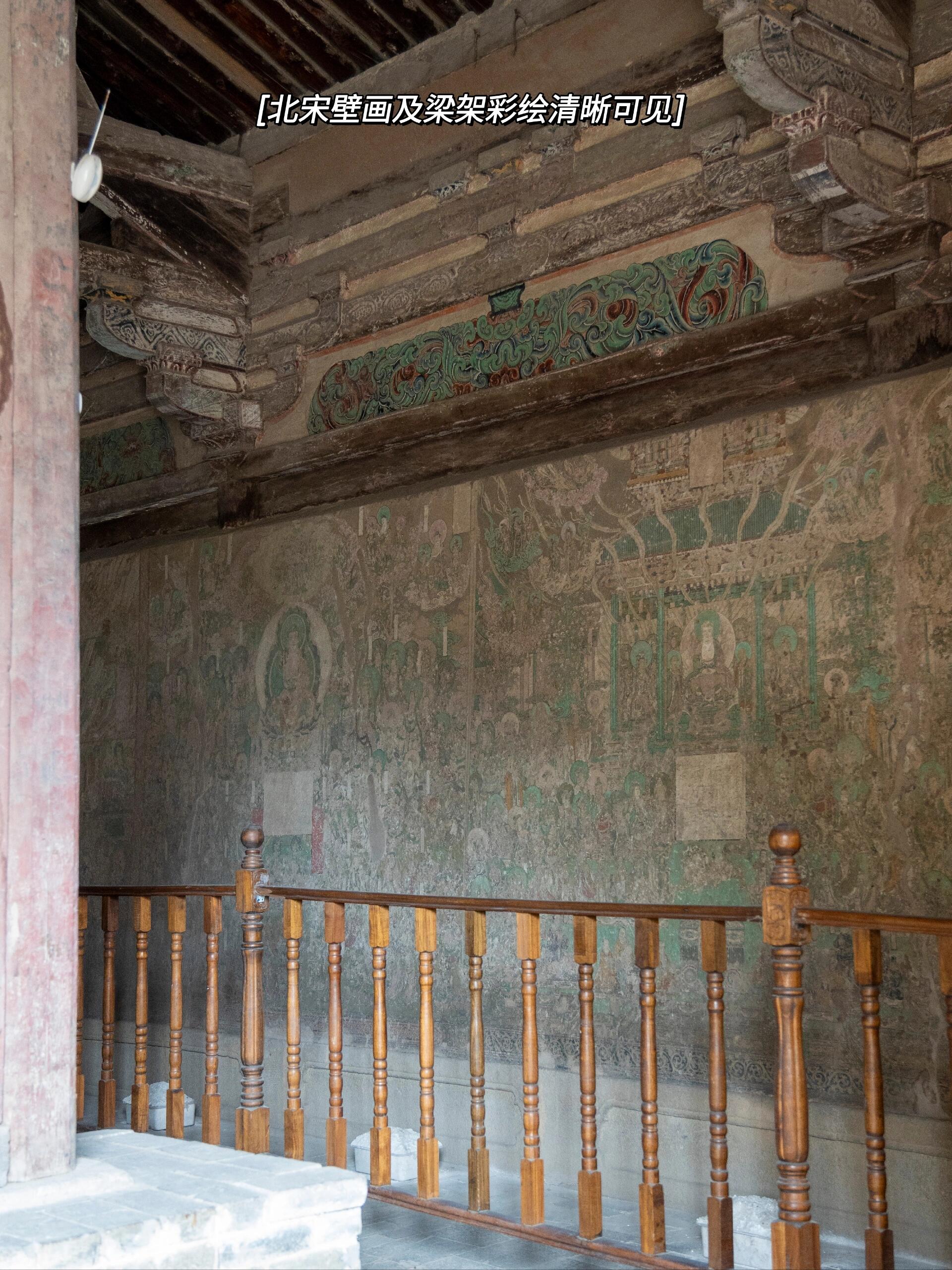 但大雄宝殿最让人震撼的,还属殿内的宋代彩绘和壁画。这些比《清明上河图》还要早几十年的艺术珍品,静静地在墙壁和梁架上等待着有缘人的发现。抬头看梁架,那些彩绘虽历经千年,色彩依然鲜艳。宋人用细腻的笔触,在木梁上描绘出各种花卉、卷草纹样,线条流畅自然,配色和谐雅致。没有夸张的造型,也没有浓烈的色彩堆砌,却将宋代的审美情趣展现得淋漓尽致。