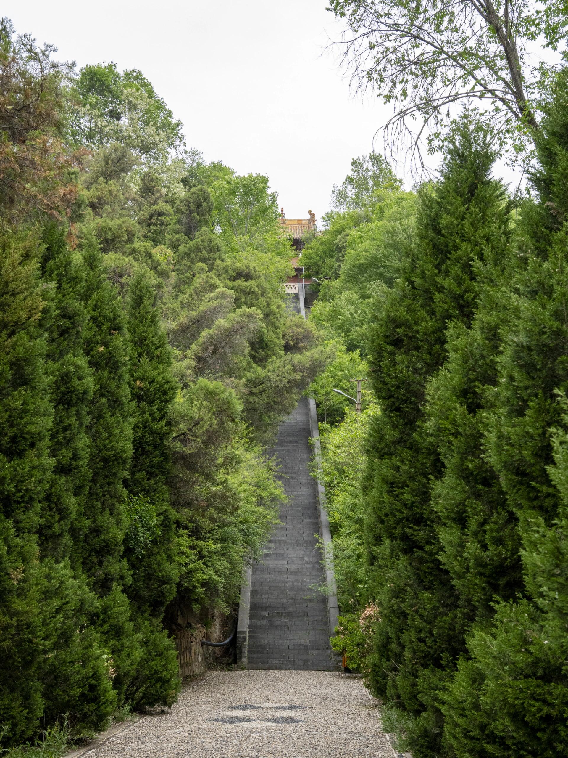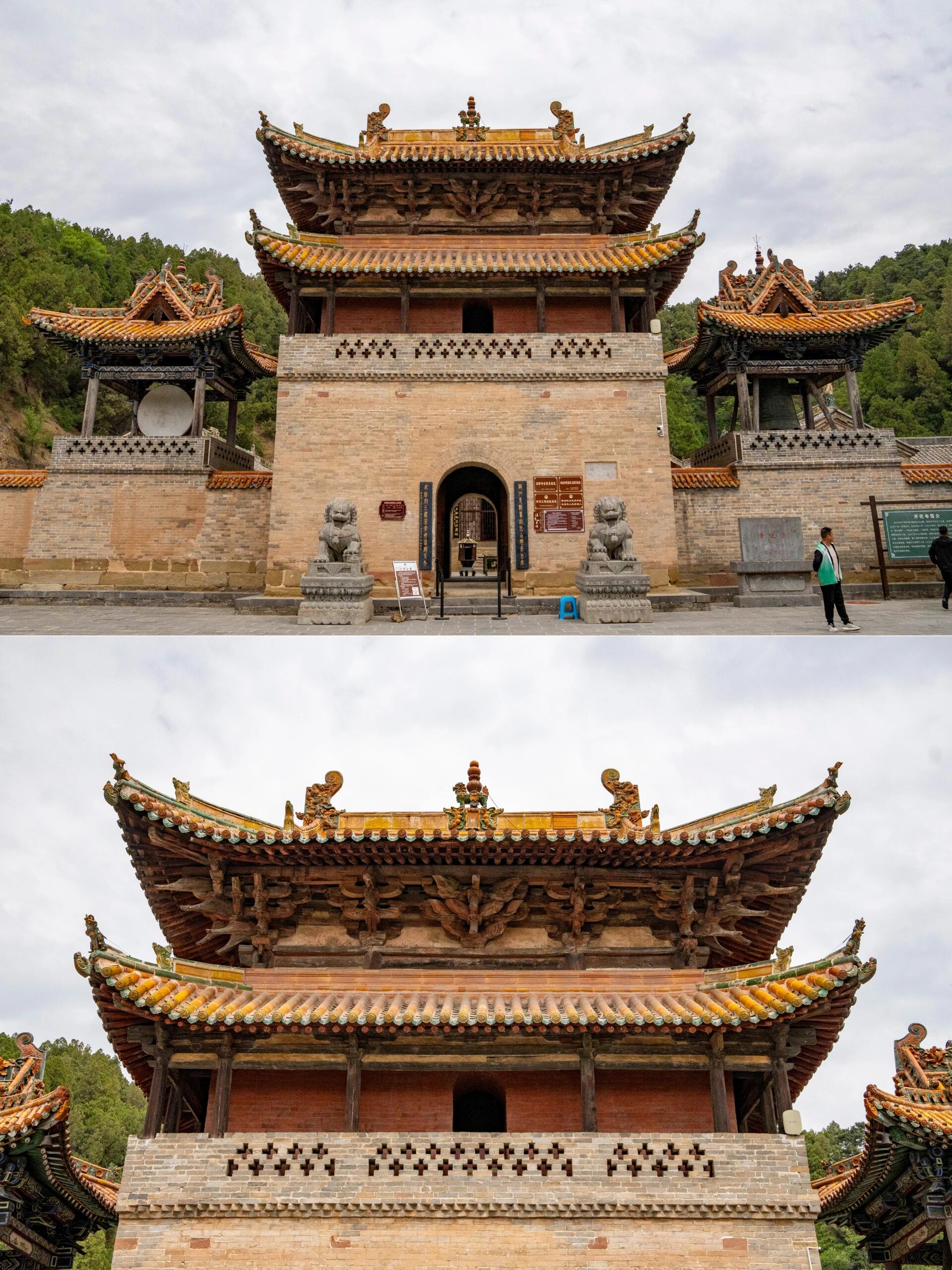 前往开化寺的路,本身就是一场与时空的对话。当车驶入舍利山脚下,189级石梯笔直向上延伸,仿佛是连接尘世与古刹的通道。每一步攀登,都能感受到太行山的雄浑气息。石阶表面被岁月磨得光滑,有些地方还残留着雨水冲刷的痕迹,这些细微之处,都在无声地诉说着过往的故事。等到终于登上石阶顶端,一座黄色琉璃瓦覆顶的大悲阁突然出现在眼前。这座明代建造的山门,虽历经数百年风雨,依然巍峨耸立。琉璃瓦在阳光下泛着柔和的光泽,屋脊上的脊兽形态各异,仿佛在守护着这座深山古寺。背后连绵的山峦,为大悲阁勾勒出天然的背景,一静一动间,尽显古建之美。