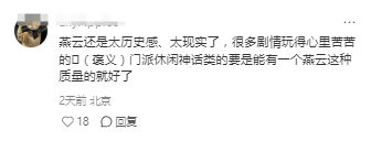 “燕云的开放大世界其实真的挺优秀的,剧情也好,文案总体在线,产出速度也已经拉到极致。”