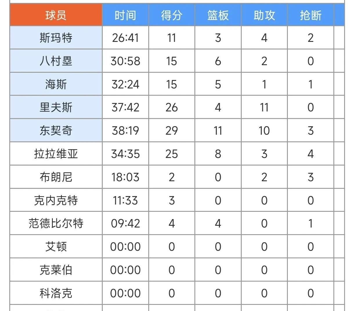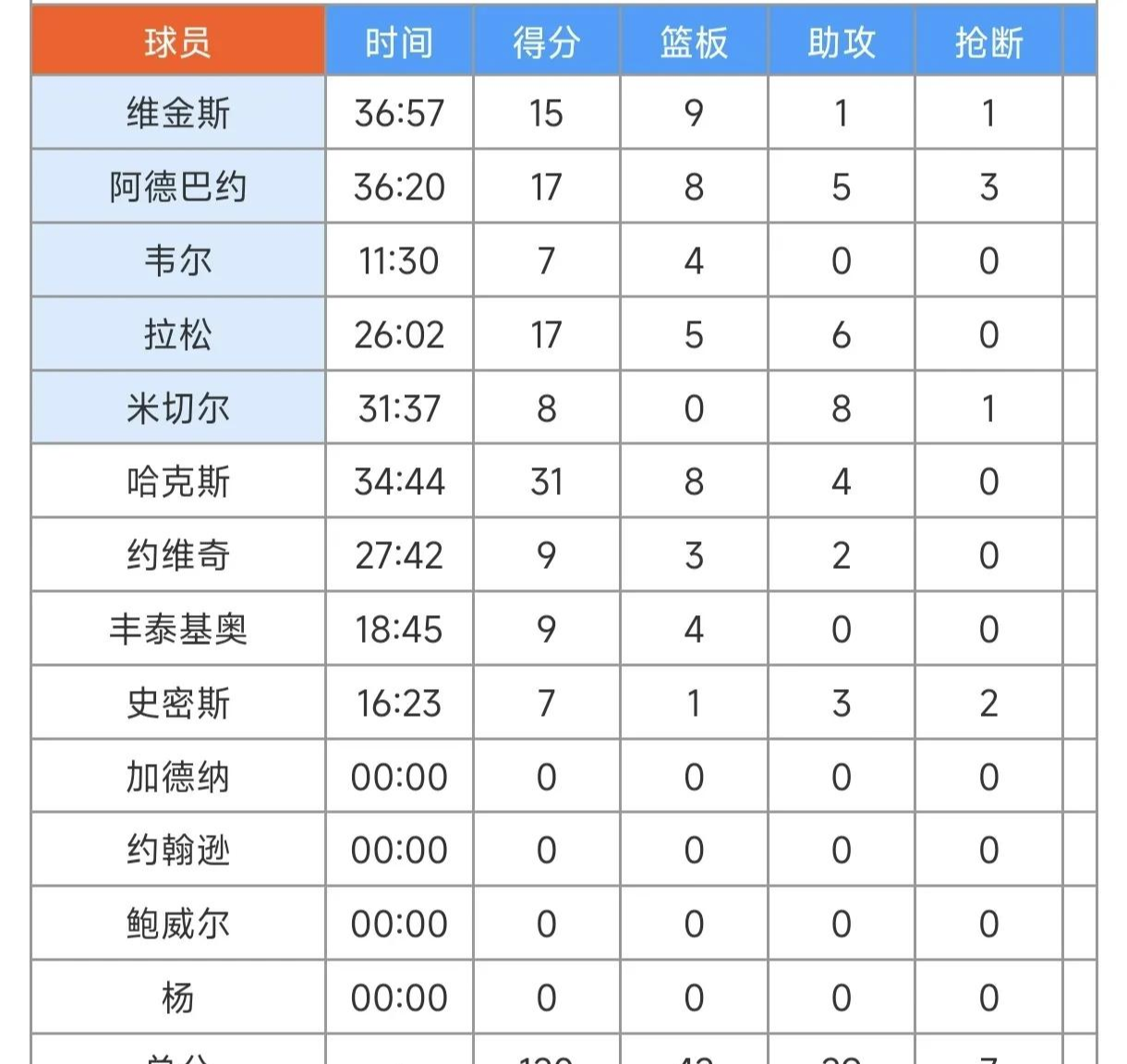 比赛数据,维金斯15分,哈克斯31分,东契奇29分,里弗斯26分,海斯15分,八村塁15分,拉拉维亚25分,布朗尼2分3断,克内克特3分。