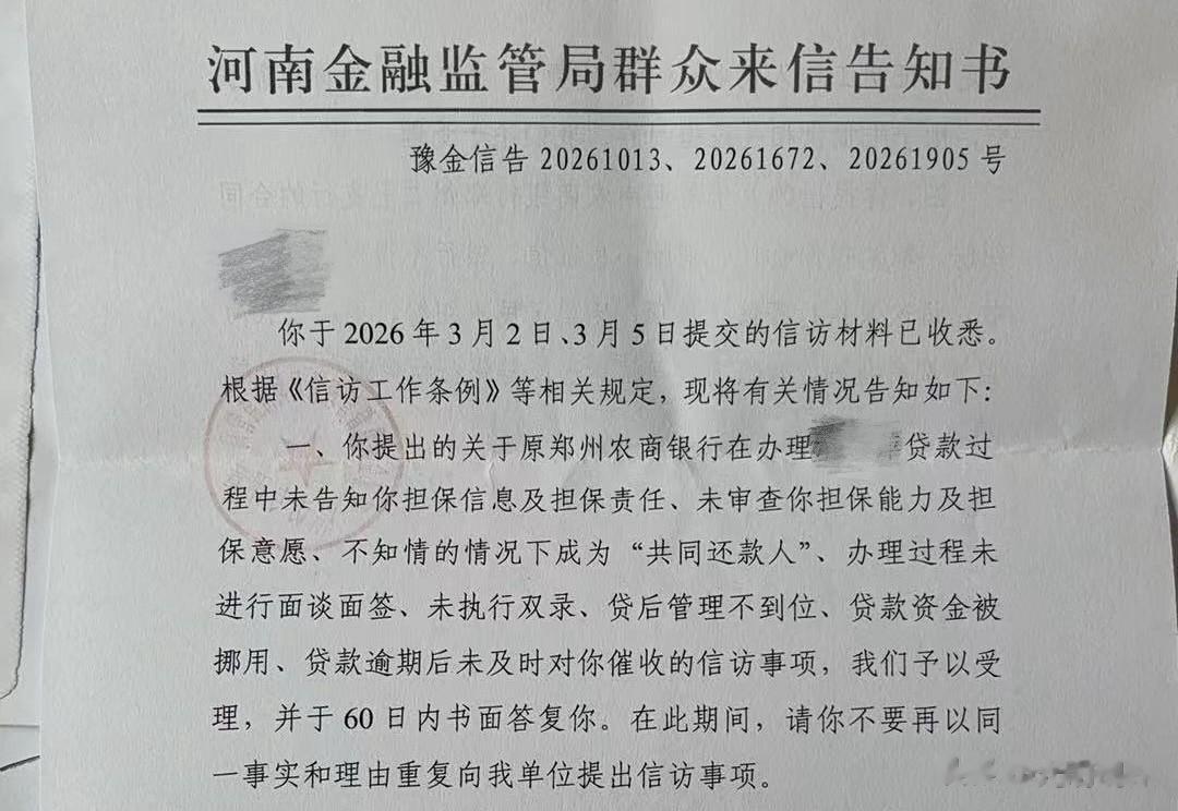 《河南金融监管局群众来信告知书》截图