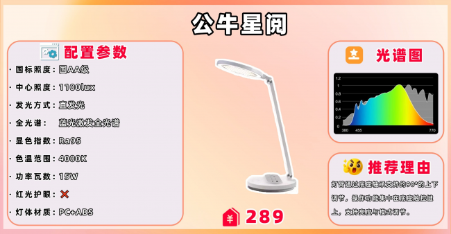 推荐理由:它的色温范围比较广3900K-4600K,可以根据需求调节色温