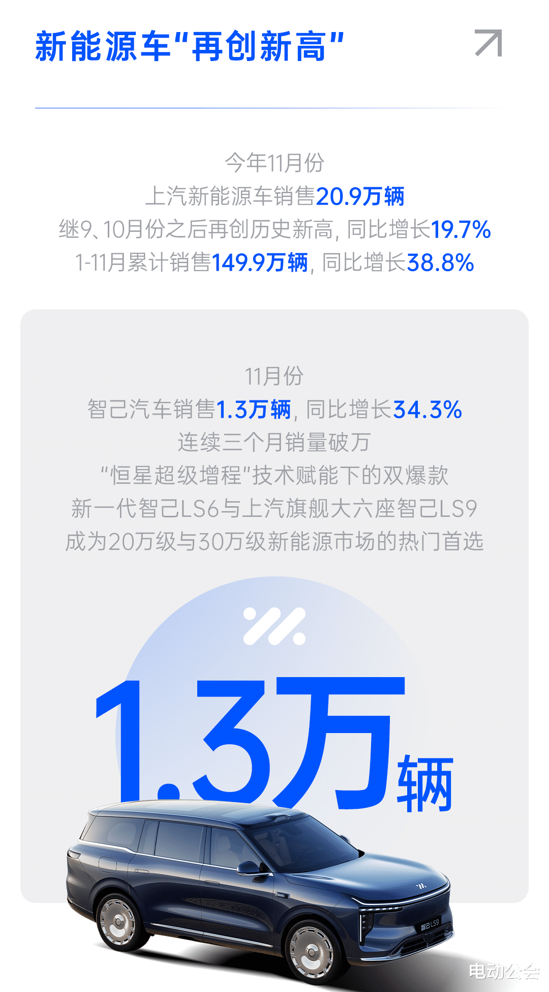 智己汽车:11月销量1.3万辆,同比增长34.3%,连续三个月破万 。