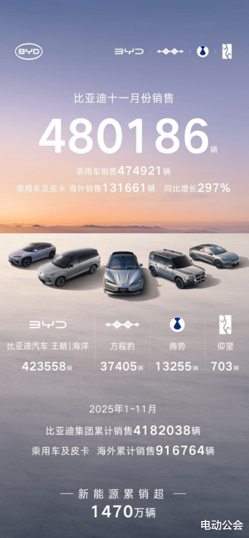 11月,比亚迪再次以一份亮眼的成绩单,展现了其作为新能源领军者的强劲势头。全月销售480186辆,其中乘用车贡献474921辆,以稳健步伐持续引领市场风潮。而乘用车及皮卡海外单月销售达131661辆,同比飙升297%,成为比亚迪增长图谱中最耀眼的一笔。
