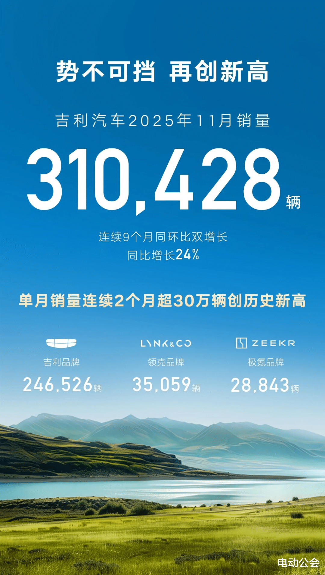 极氪11月销量28,843辆,环比增长35%,累计销量突破60万辆;领克新能源车型销量26,303辆,占比75%,1-11月累计销量31.7万辆,同比增长22%。