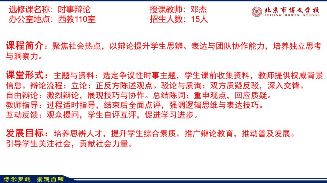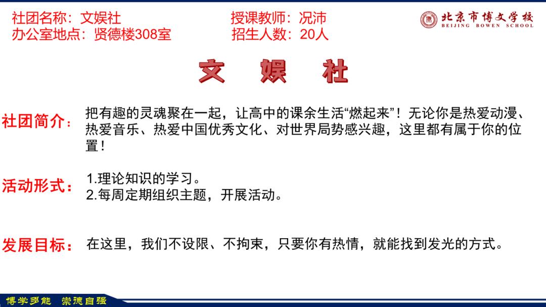 未来,我校将继续紧扣房山区打造北京西南教育新高地的发展目标,持续优化社团与选修课布局,强化师资与课程建设,深耕五育融合,让每一门课程都成为学生成长的沃土,让 “博学多能、崇德自强” 的校训扎根校园,让每一位博文学子在适合自己的教育中全面发展、绽放光彩。
