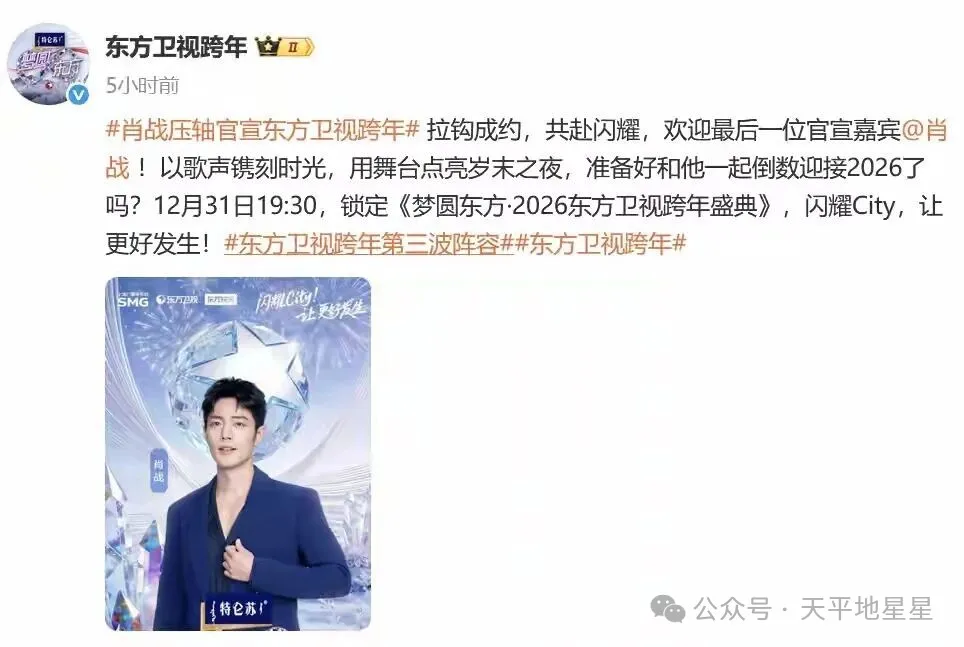 只不过随着东方卫视官宣肖战加入的那一刻,这个顺序就有点变了,也就是说这场跨年晚会最终变成了湖南卫视和东方卫视的battle。
