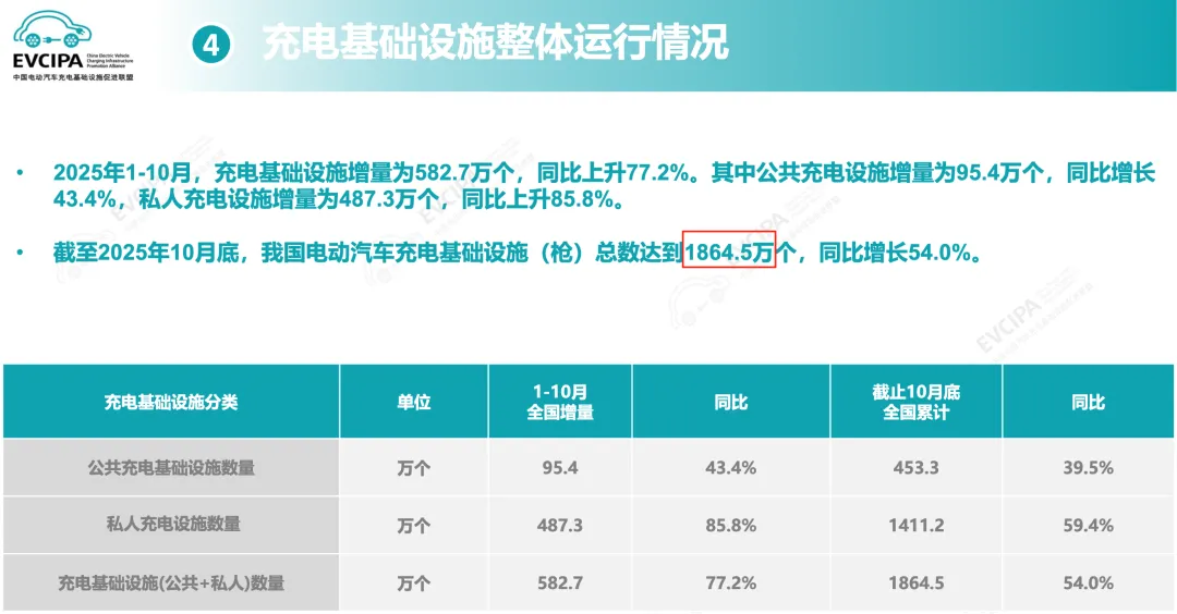 数据显示,截至2025年10月底,全国充电桩总数达1864.5万个,其中公共充电桩453.3万个,私人充电桩1411.2万个,桩车比优化至1:1.8,即每1.8辆新能源汽车配备1个充电桩。区域布局上,高速公路服务区充电设施覆盖率达98%,县域覆盖率达97.31%。
