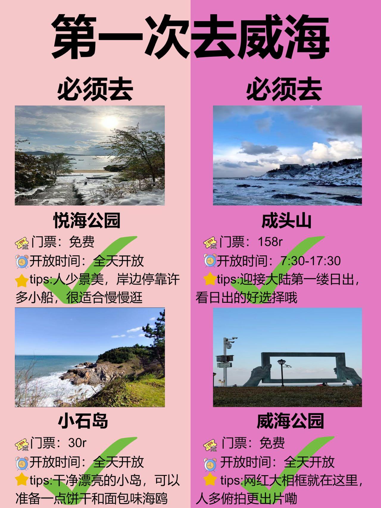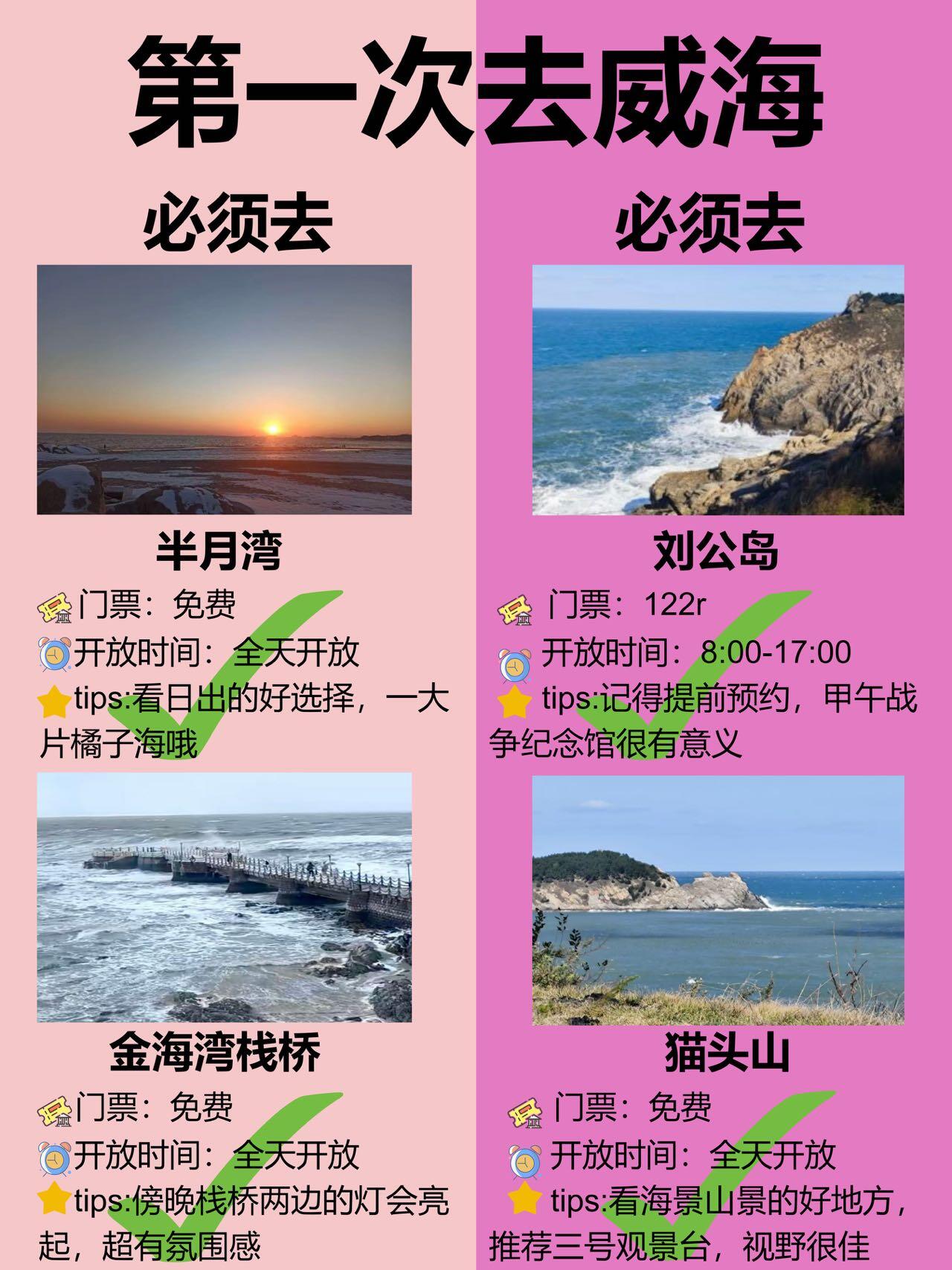 👀早起半月湾看日出🌅,提前半个小时到,就慢慢看着海平面从粉变成了一大片橘子🍊海,好美丽。然后去海源公园⛲️,岸边停靠许多许多小船🚤,里面原来是威海老港头,很好逛的一个公园。接着去找幸福门喽,实在是很显眼,可以登上观景台,下面也很漂亮,我们没有再上去啦。走两步就到刘公岛码头⛵️啦,坐船出发刘公岛,甲午战争纪念馆很有意义,不虚此行,里面还有暖气,很暖和了。接着去威海公园找大相框🖼️合照,就去韩乐坊吃大餐,巧克力渔家好好吃,喜欢海鲜蒸汽锅,好食材看得见,很鲜甜了,还有好多家常菜。
