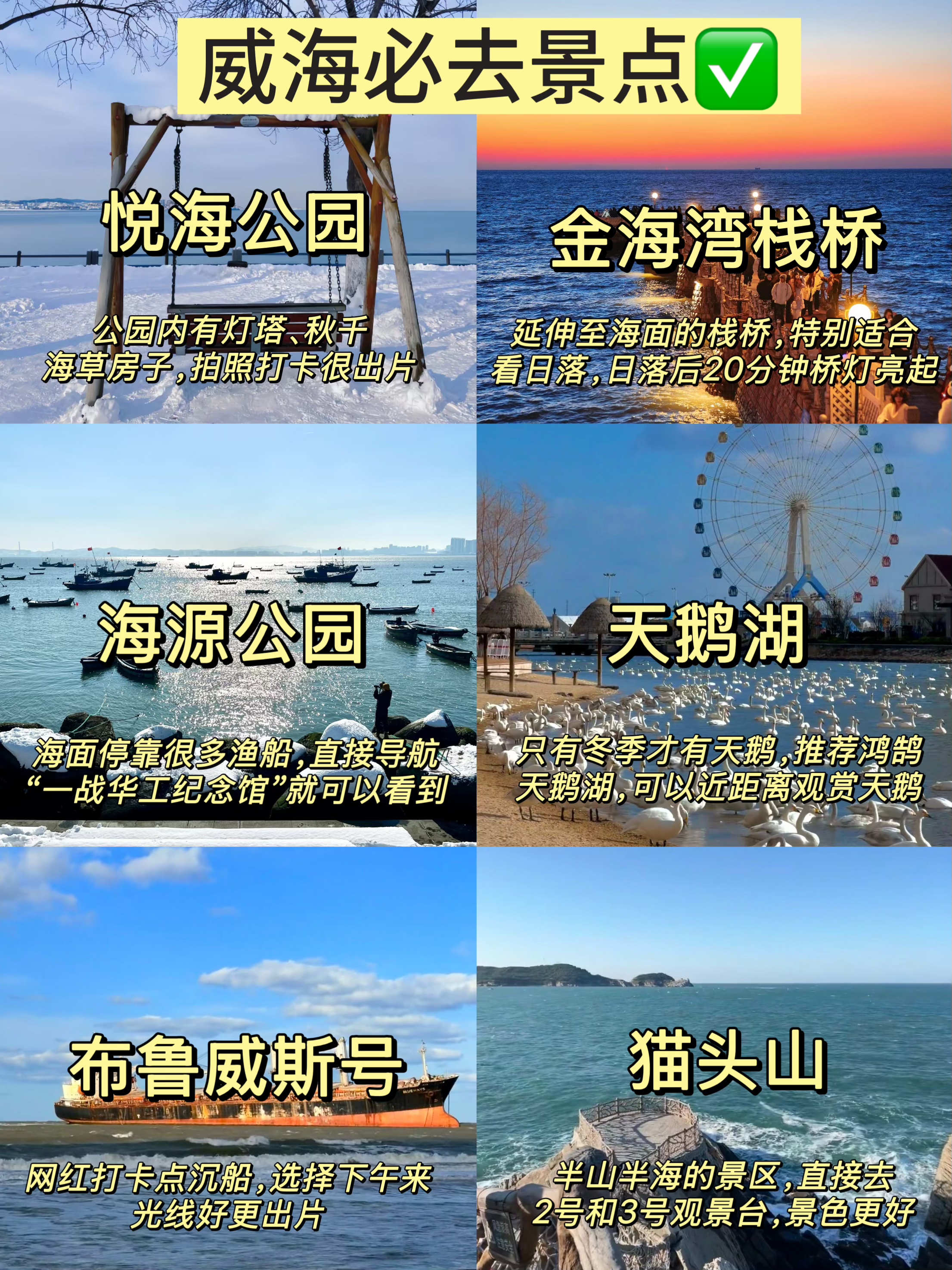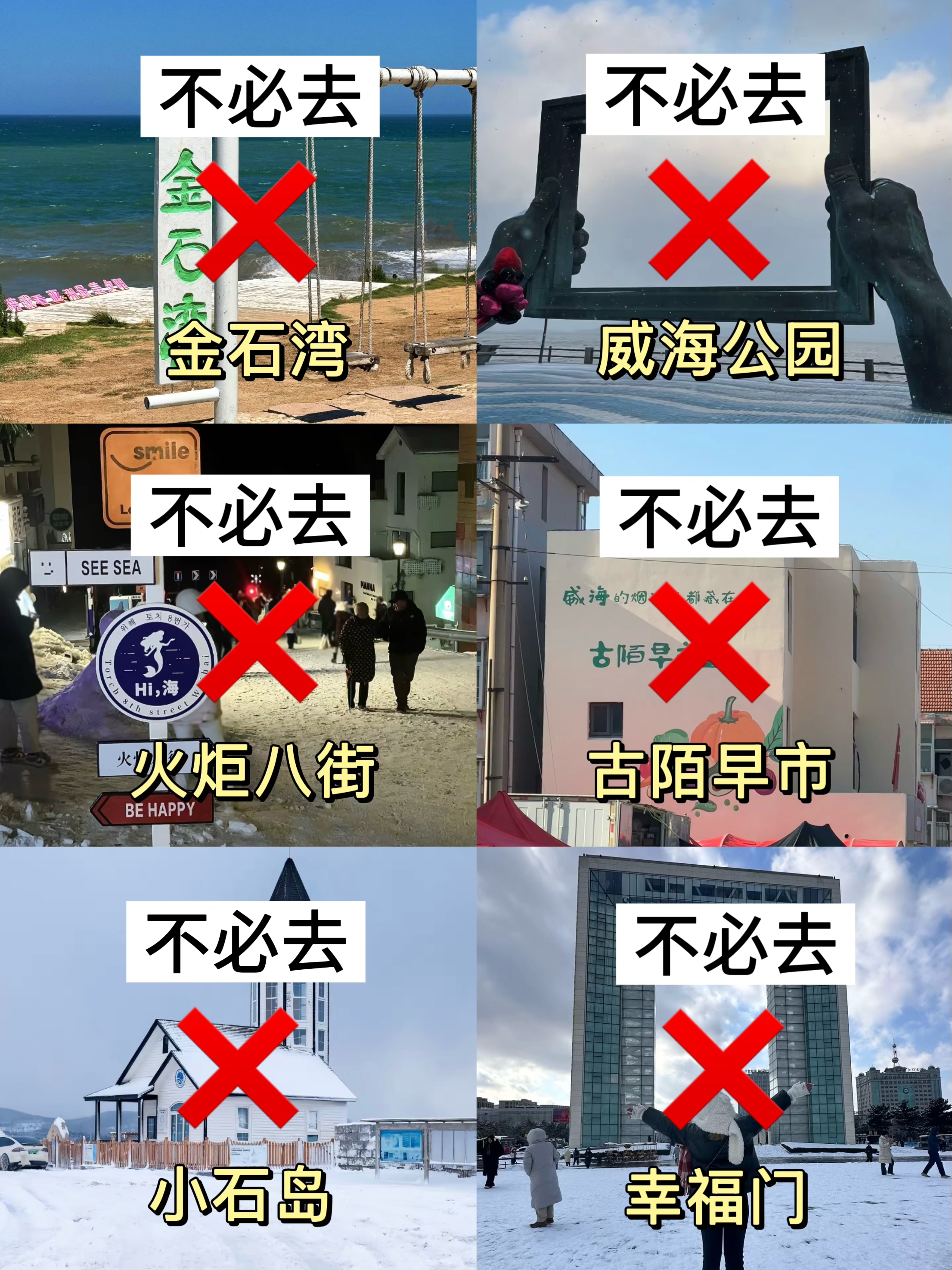 ✔️个人感觉古陌早市、幸福门、金石湾、小石岛没必要去,威海公园、火炬八街打卡就行,不用深度游玩!