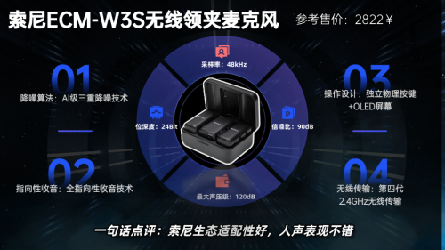 索尼ECM-W3S延续品牌专业音频设备的严谨设计风格,采用金属质感机身搭配可旋转强力领夹,质感扎实耐用,发射器重14克,佩戴稳固不滑落,适配长时间专业拍摄。充电盒采用简约方正设计,内置磁吸收纳结构,取放便捷,同时具备良好的防护性。配件专业齐全,含专业防风罩、多规格转接头及便携收纳包,满足新闻采访、纪录片拍摄等专业场景需求。