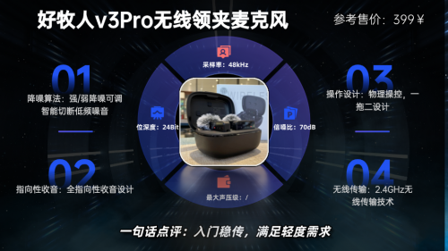 好牧人v3Pro主打实用主义与高性价比,采用简约大气的机身设计,搭配可旋转金属领夹,佩戴稳固且耐用,发射器重12克,长时间佩戴无明显负重感。充电盒采用大容量收纳设计,不仅能为麦克风充电,还可作为临时收纳盒,保护设备不受损坏。配件丰富实用,含多规格防风罩、双转接头、收纳袋及监听耳机,一站式满足直播、短视频创作需求。