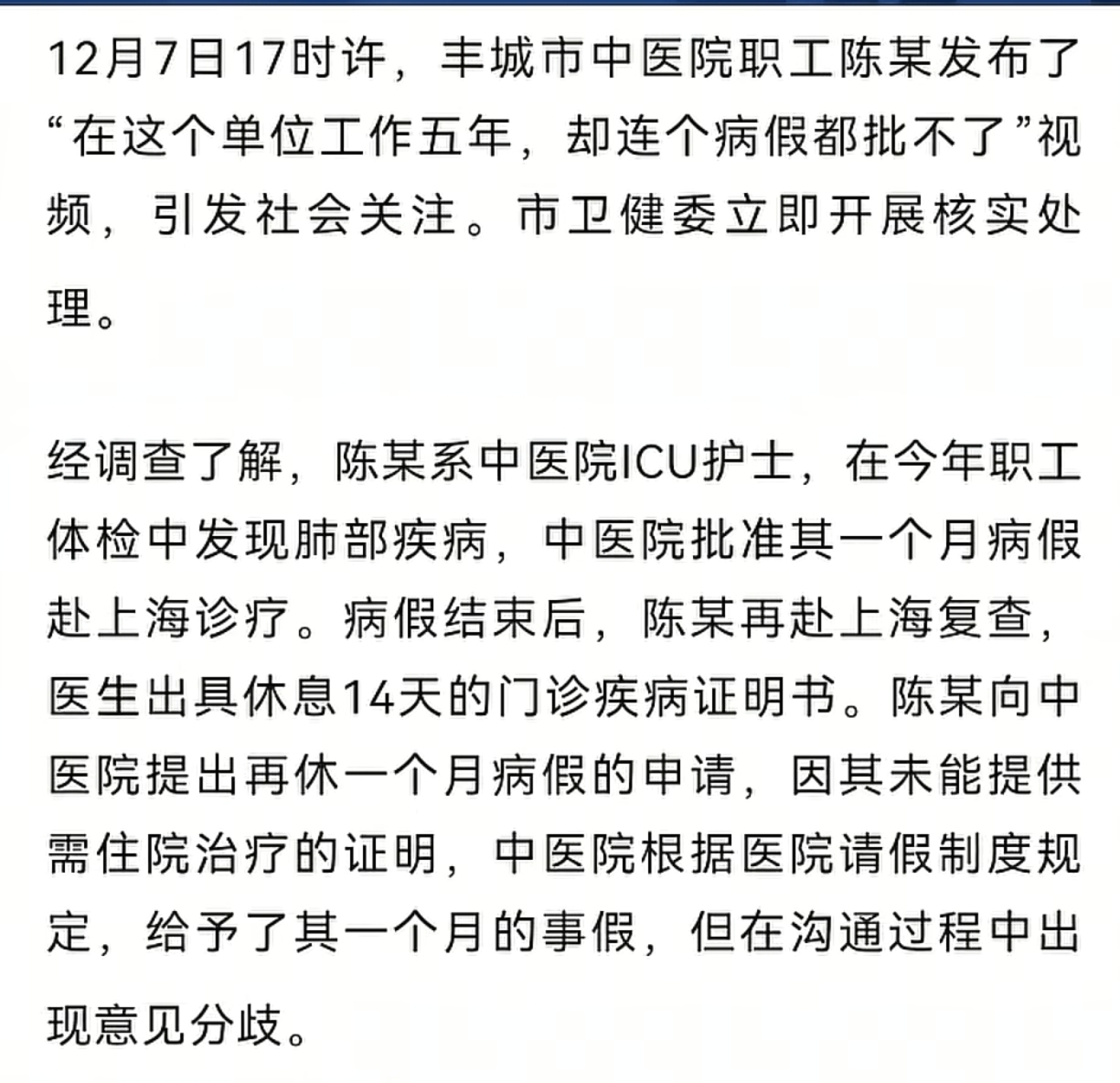 近日,网红“拓河秋树”在网上发布了一条维权视频,他的妻子“陈秋树”是丰城中医院的一名护士,不幸患了肺癌,向医院请了一个月的病假去动手术,然而等她手术完回医院向再请一个做的病假时,发现医院竟然不给她开病假条,要请只能请事假。