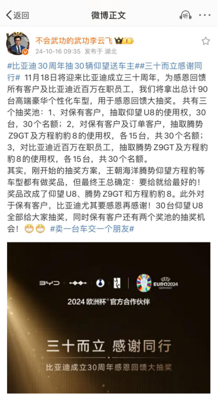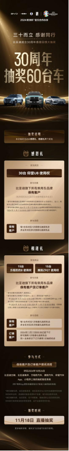 1994-2024,激荡三十载,比亚迪即将在2024年11月18日迎来30周年。回顾比亚迪30年历程,有坎坷与低谷,也有高光与荣耀。一路走来,车主是比亚迪身后最坚实的基石。 为庆祝比亚迪成立30周年,即日起,比亚迪隆重开启感恩回馈大抽奖,感谢新老客户长期以来的支持。 此次抽奖活动分为“感恩礼”和“相逢礼”两大奖池,奖品共计60台比亚迪旗下在售新车使用权。其中,“感恩礼”奖品为30台仰望U8使用权,“相逢礼”奖品为15台腾势Z9GT和15台方程豹豹8使用权,诚意满满!保有客户可同时参与“感恩礼”及“相逢礼”抽奖,订单客户可参与“相逢礼”抽奖。 2024年10月16日12:00之前已下订的所有订单客户,及即日至11月17日0:00前,在比亚迪王朝、比亚迪海洋、方程豹汽车、腾势汽车、仰望汽车App或小程序完成下订的订单客户,都可参与抽奖,均有机会带走这份幸运。