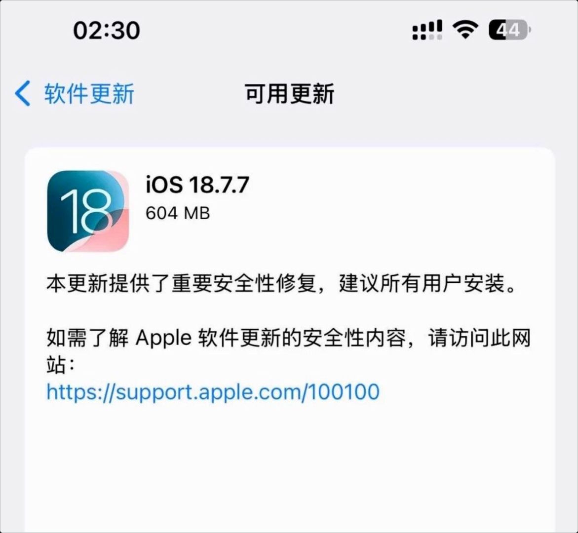 今日凌晨,苹果向用户推送了 iOS 双系统版本更新。分别为:iOS 26.4.2 正式版(版本号为:23E261)和 iOS 18.7.7 正式版(版本号:22H352),共两个正式版本。这两个版本未经测试版,属于突然推送的系统版本。