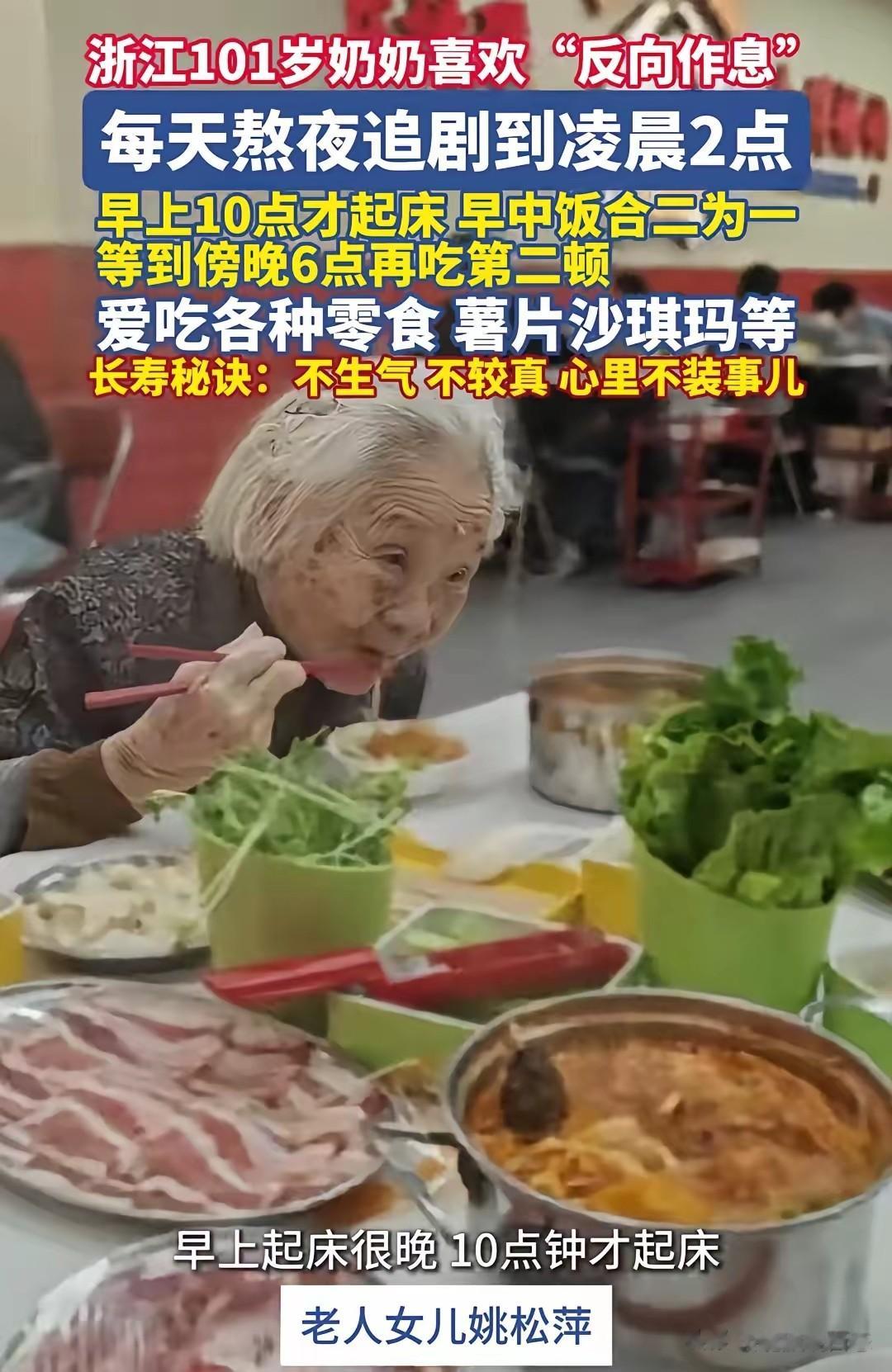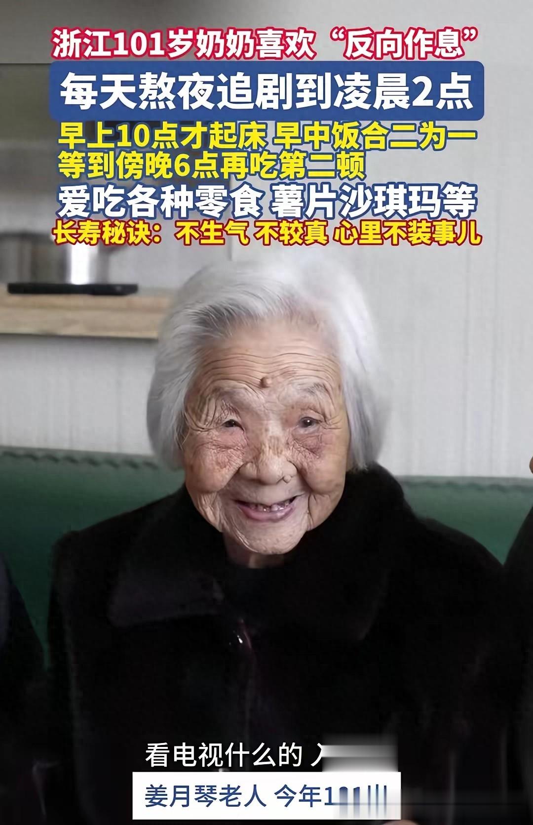 浙江一位101岁的姜奶奶,以“反向作息”的生活方式吸引了众多关注。