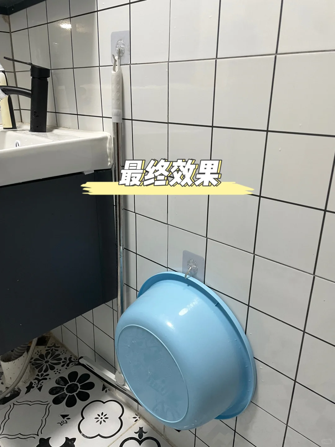 将粘钩反着贴在卫生间的浴室或者是洗手台附近的墙面上,大家就可以直接将用完的洗脸盆或者是洗脚盆挂在上面了,非常的方便。