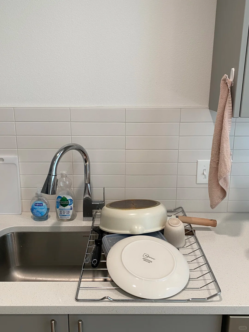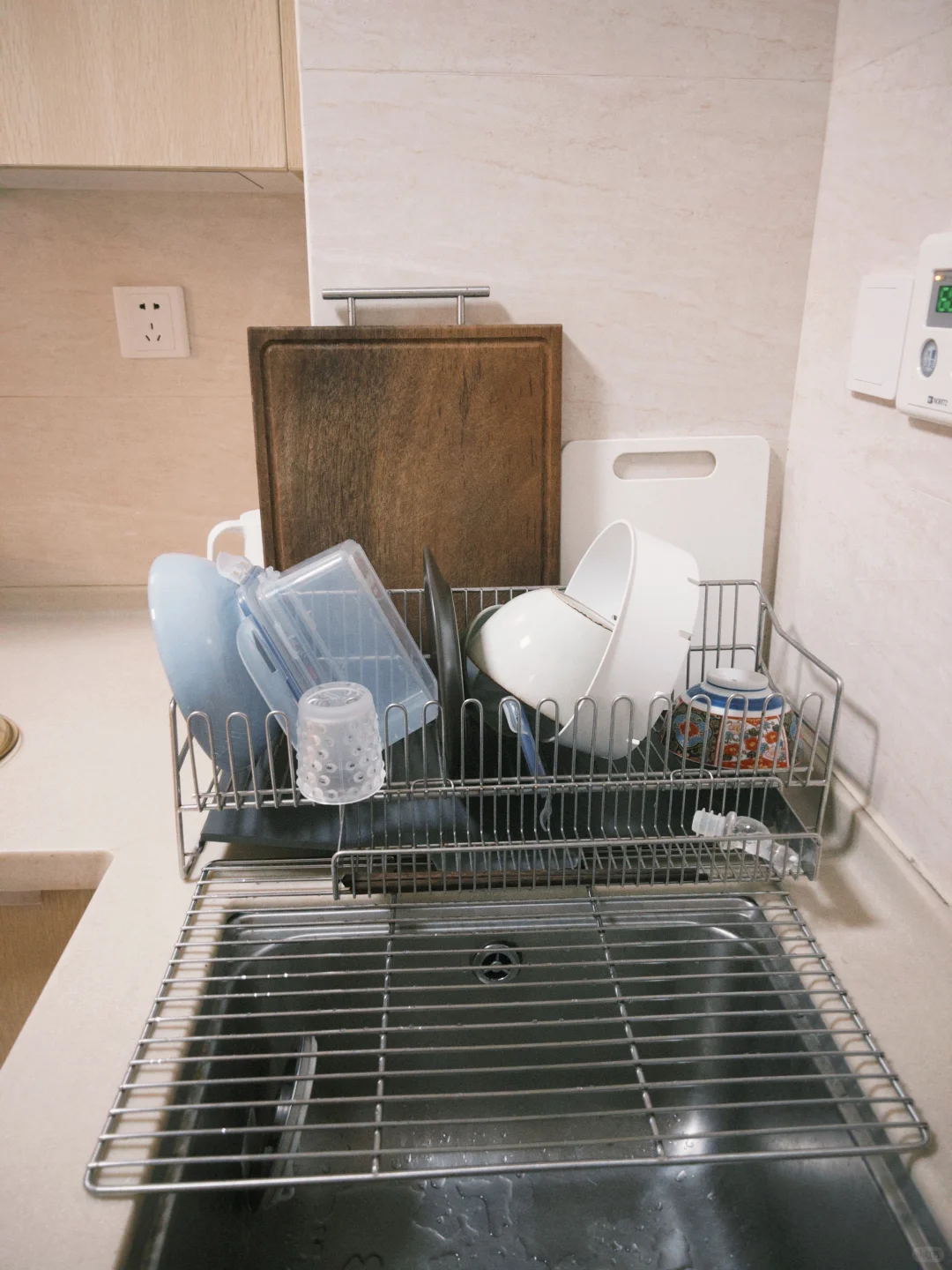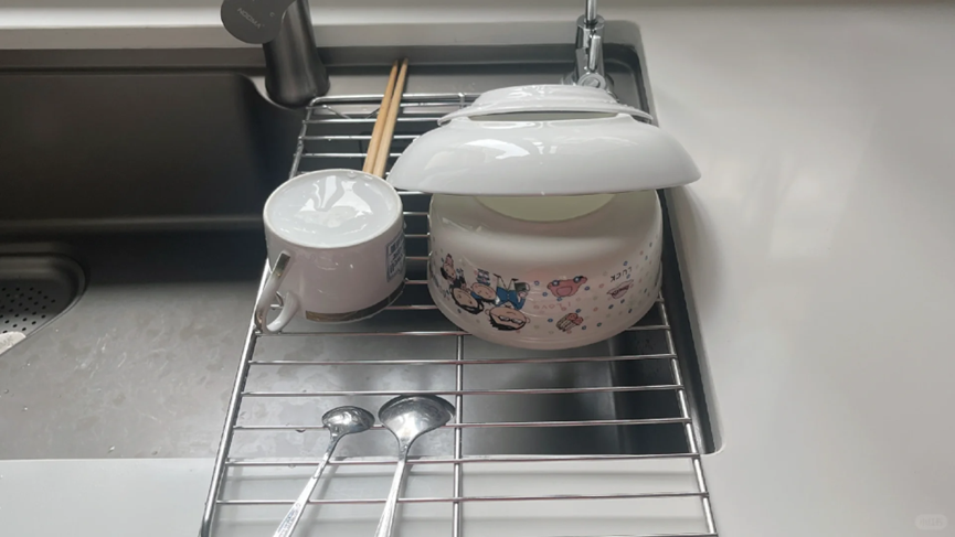 大家都可以将其倒着放在厨房水槽上,刚刚刷完的餐具,就可以直接放在烤箱架上沥干水分。