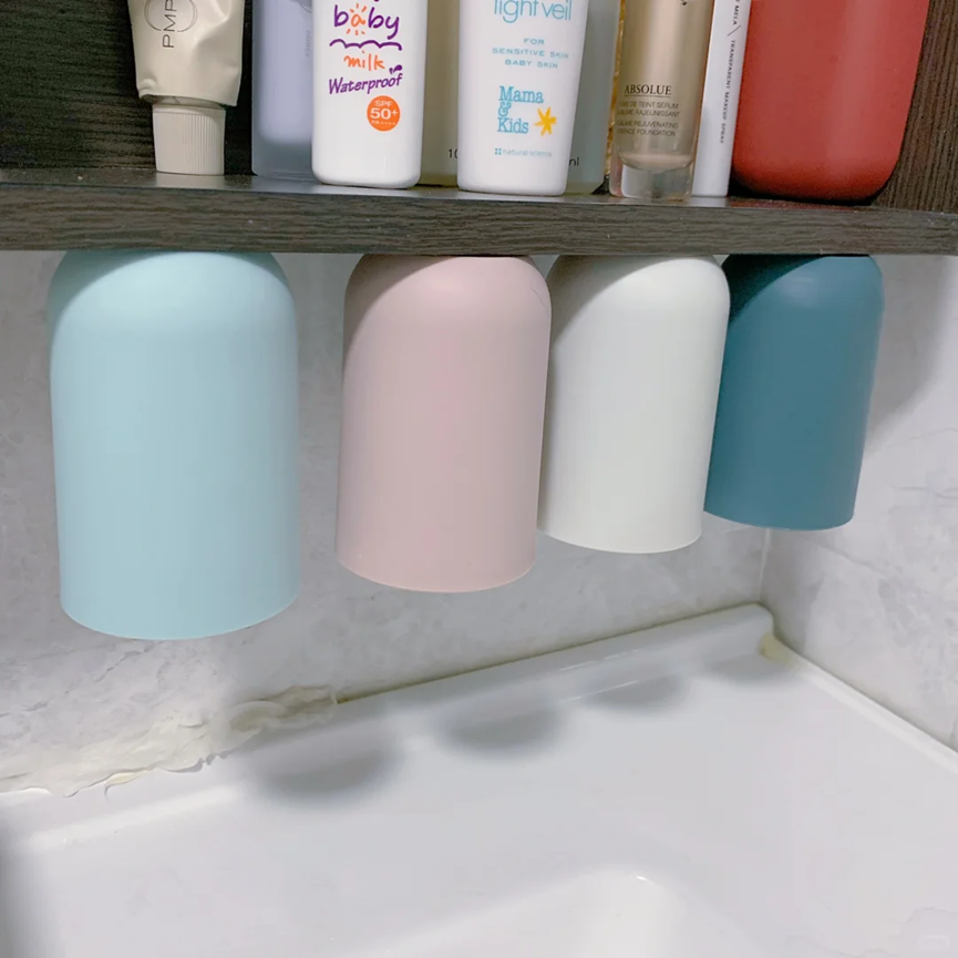 大家也可以尝试换一个思路,只需要准备一个橡胶磁贴和两片带胶的铁片,就能够直接将用过的漱口杯倒着放在镜柜的下方了。