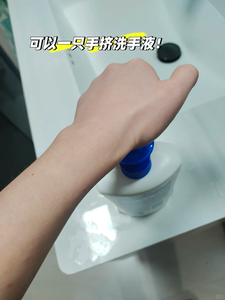这个时候大家不妨换一个思路,将洗手液以及洗洁精等物品反着放,这样就可以直接用掌心按压,一只手就可以轻松完成操作了。