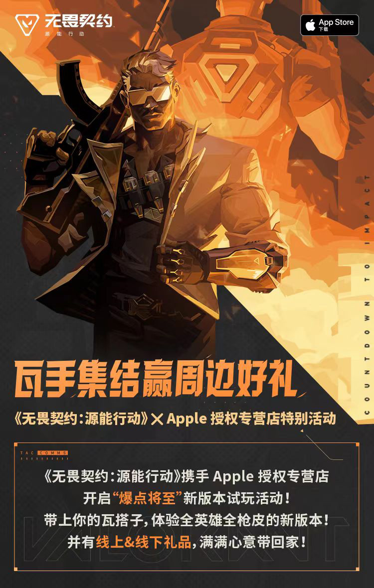 2025年12月24日至2026年1月6日,《无畏契约:源能行动》还携手Apple授权专营店举办特别活动,玩家或对这款游戏感兴趣的朋友,可预约到指定Apple授权专营店体验游戏新版本的试玩活动,参与可获得礼品。据介绍,活动期间试玩的“爆点将至”新版本,为《无畏契约:源能行动》全英雄全枪皮解锁的试玩版本,现场完成签到打卡即可领取独家定制游戏道具礼包,完成体验后有限量的贴纸和冰箱贴,参与互动活动还可赢抽奖好礼。