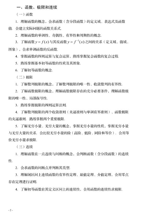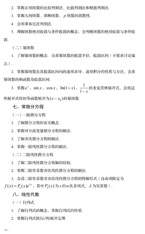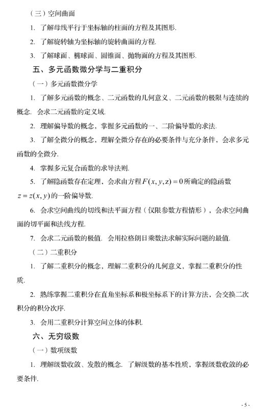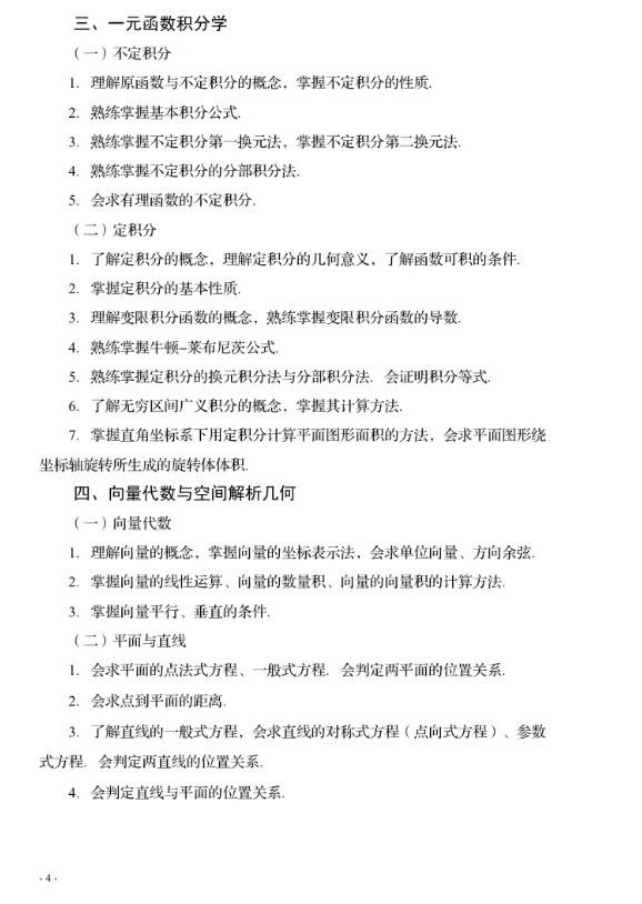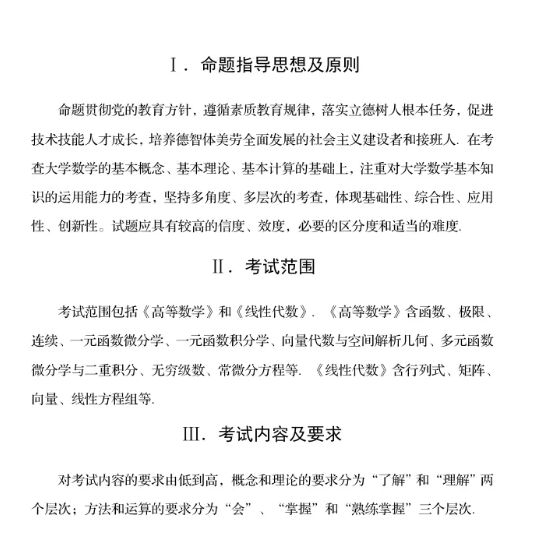 考试范围: 包括《高等数学》和《线性代数》。《高等数学》含函数、极限、连续、一元函数微分学、一元函数积分学、向量代数与空间解析几何、多元函数微分学与二重积分、无穷级数、常微分方程等。《线性代数》含行列式、矩阵、向量、线性方程组等。