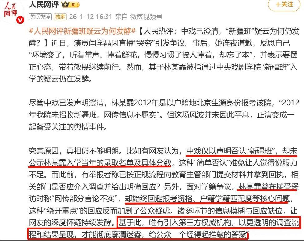 另外,更让闫学晶害怕的是,就连自己的儿子也被其牵连,“新疆班风波”被网友扒了出来,尽管中戏发声明辟谣,但还是缺少了说服力,目前仍有不少网友在不停地举报。甚至连人民网评也站出来发声,直接把压力给到了中戏。