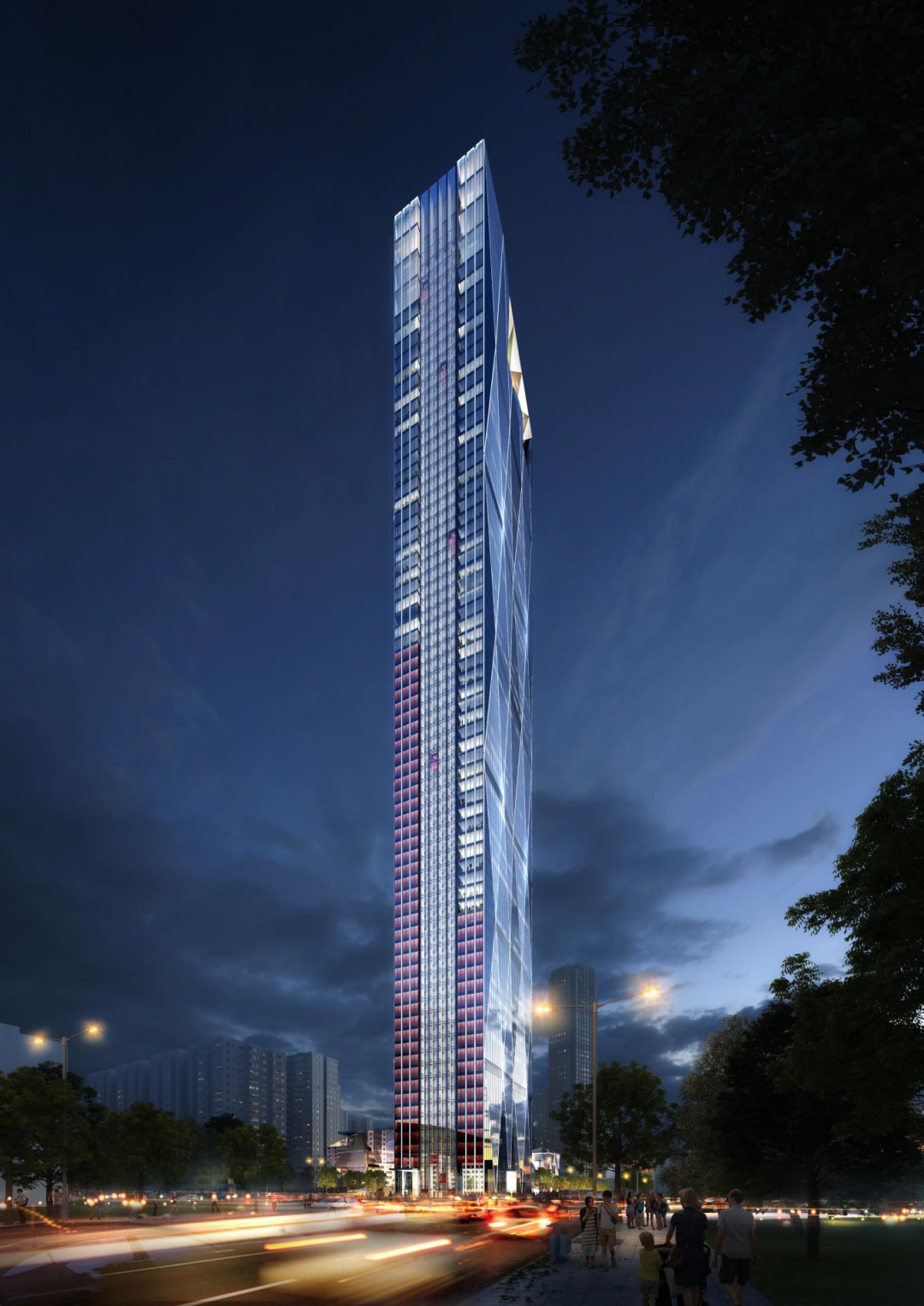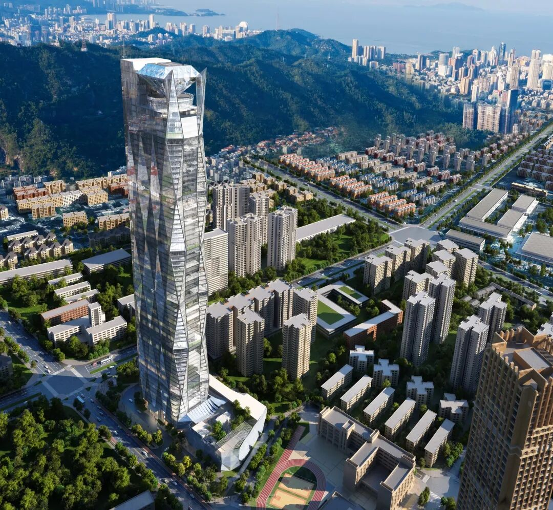 项目地处沿海高风压区,抗震设防烈度为7度,结构设计面临严峻挑战。尤其引人注目的是其独特的“钻石造型”顶部和超常规的高宽比。为应对强风环境下弱轴刚度不足的难题,建筑创新采用“框架‑筒体‑外伸墙”结构体系,以更具经济性的方式有效提升结构整体抗侧刚度,展现出高超的技术整合能力。