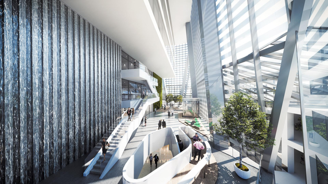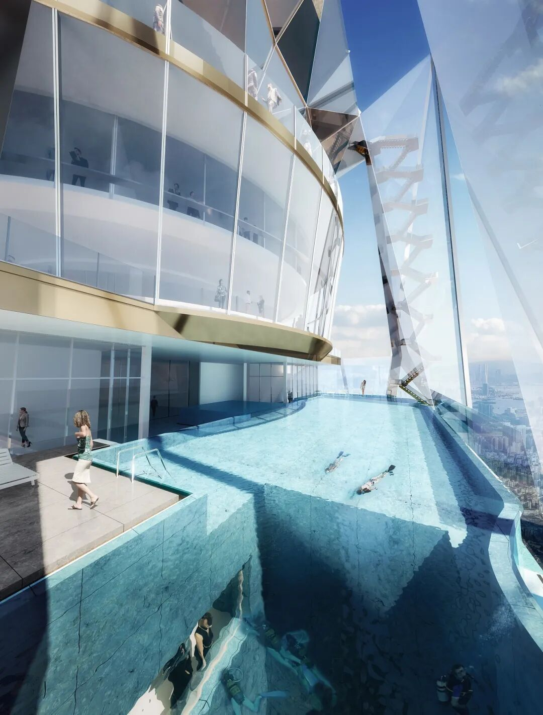 除了办公功能,设计团队与 En-Visions Associates 合作,在垂直空间内融入了多样体验——顶层设有旋转餐厅,高处悬挑出无边际泳池与深潜训练池,并规划了钻石博物馆,试图让建筑不仅矗立于城市天际,也承载人文与休闲的更多可能。