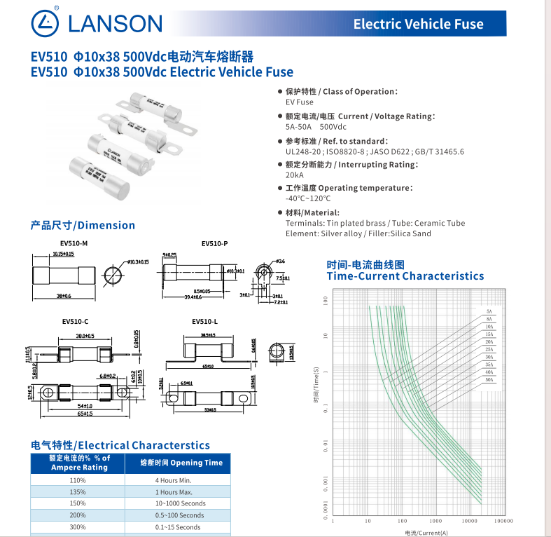 电动汽车熔断器的核心诉求是 “快速响应” 与 “高可靠性”。良胜通过三大技术创新实现突破:一是采用银铜复合熔体结构,利用金属的不同熔点特性,在过载时快速熔断,短路时瞬间分断;二是优化陶瓷管内部填充工艺,使石英砂均匀分布,提升电弧熄灭效率;三是开发低温焊接技术,确保端子与熔体的连接强度,避免振动环境下的接触不良。以 EVH10 型号为例,其在 500% 额定电流下熔断时间仅 0.05~1 秒,为电池包短路提供 “毫秒级” 保护。