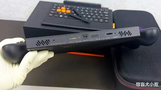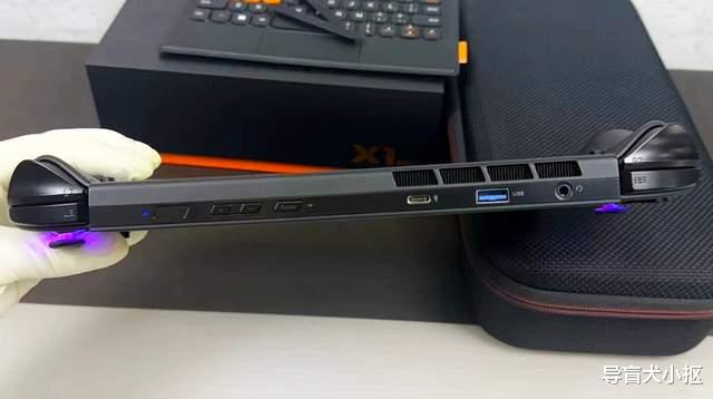 翻转机身,x1mini的屏幕中框上,集成了掌机的拓展接口与部分按键。比如中框顶部有电源、音量加减、指纹触摸按键,设计了标准的雷电接口、usb3.1接口、耳机孔等,靠下的位置还有醒目的出风口,与pc硬件设计看齐。中框底部有第二个雷电口、tf卡槽和进气孔等,同样和pc机设计保持一致。至于机身后盖,除了散热孔,还有一个可折叠的支架,便于pc模式下的使用。