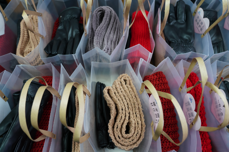 社区党群服务中心活动室内,20个包含手工围巾、黑色皮手套的礼物袋整齐摆放,围巾编织的纹路各不相同,却都同样厚实柔软。“那孩子总是不戴围巾,手套也很薄。”55岁的志愿服务队队长姚萍说:“我织这两条围巾用了4天,每天只要有时间都在织。”